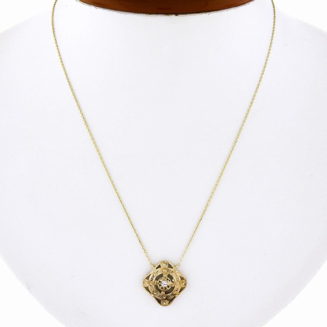 An antique solid 14k yellow gold pendant necklace, with 1 round cut cubic zirconia (2.1mm). Adjustable at 16 and 18 inch cable link chain, 2.50 grams total weight, pendant measures 16.45x16.35mm.