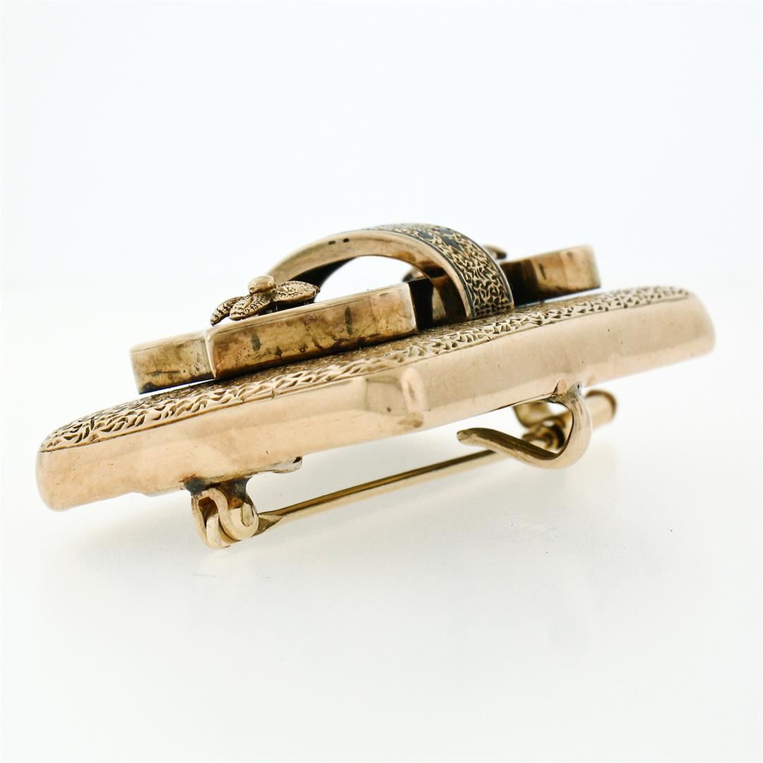 An antique solid 14k yellow gold with black enamel work floral pin brooch. Measures 35.0x23.25mm and weighs a total of 10.0 grams.