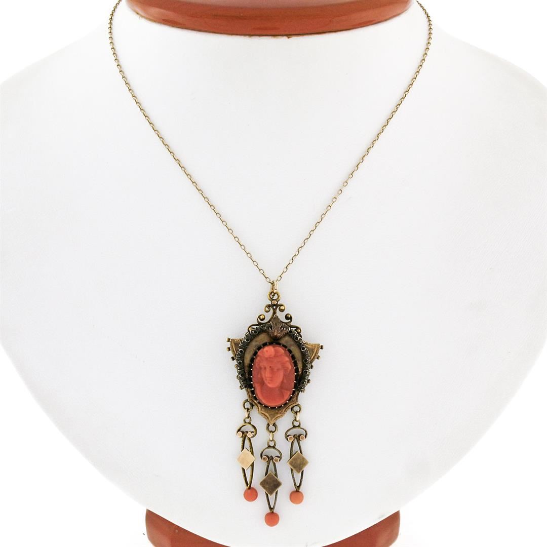 An antique solid 14k yellow gold dangle pendant necklace, with 1 oval cut carved natural coral (15.0x10.25mm), and 3 round bead shape natural corals (3.45-3.65mm ). 17 inch cable link chain, 6.34grams total weight, pendant measures 60.50x24.25mm.