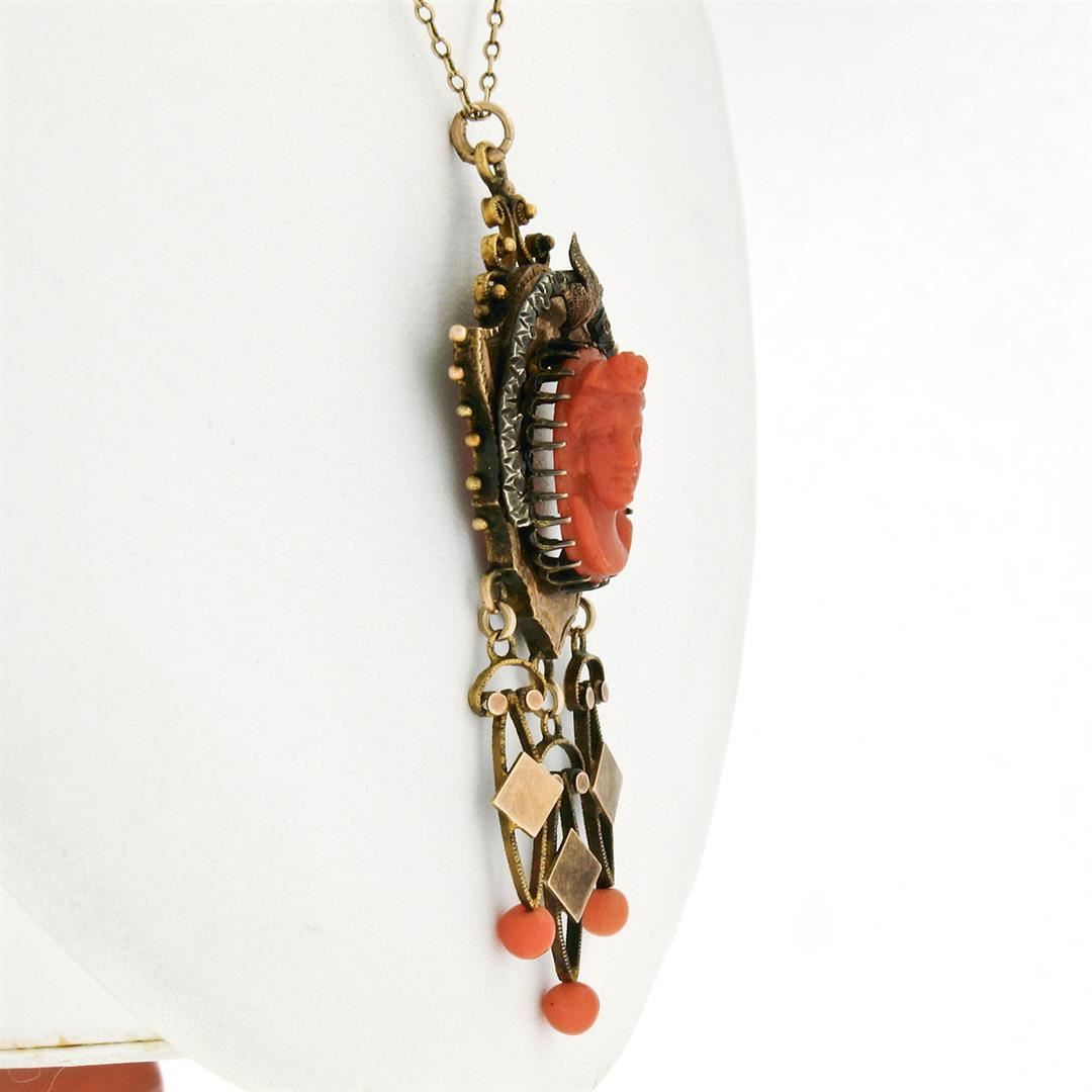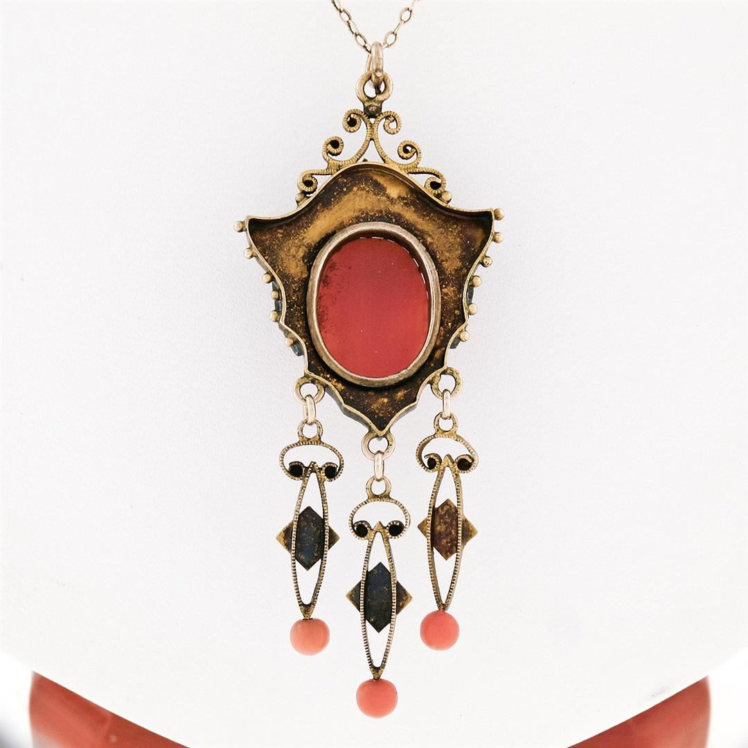 An antique solid 14k yellow gold dangle pendant necklace, with 1 oval cut carved natural coral (15.0x10.25mm), and 3 round bead shape natural corals (3.45-3.65mm ). 17 inch cable link chain, 6.34grams total weight, pendant measures 60.50x24.25mm.