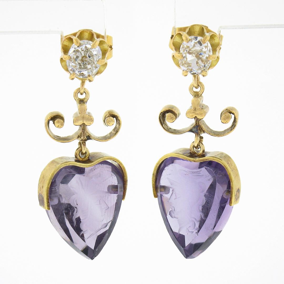An antique solid 14k yellow gold drop earrings, with heart cut carved natural amethysts (12.6x10.3mm each), and 2 old mine cushion cut natural diamonds (G/H - SI1/SI2 ; 0.74ctw). The earrings measure approximately 29.6x11.4mm and weigh a total of 5.91 grams.
