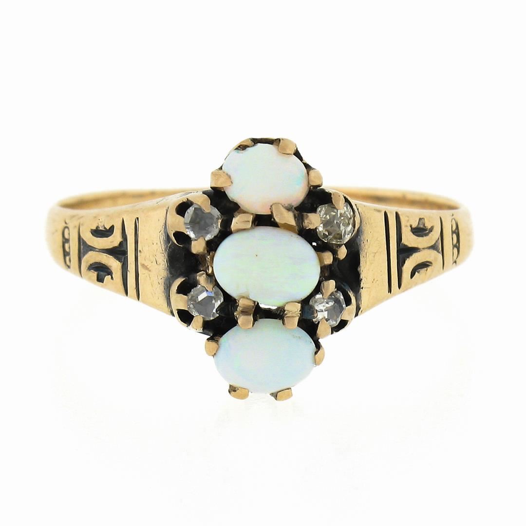 An antique solid 14k yellow gold ring, with 3 oval cabochon cut natural opals (4.6x3.2mm to 3.8x2.8mm each), and 4 rose w/ single cut natural diamonds (H-J - SI1/SI2 ; 0.06ctw). The ring is size 7.5, weighs a total of 2.20 grams, and measures 11.2mm wide.