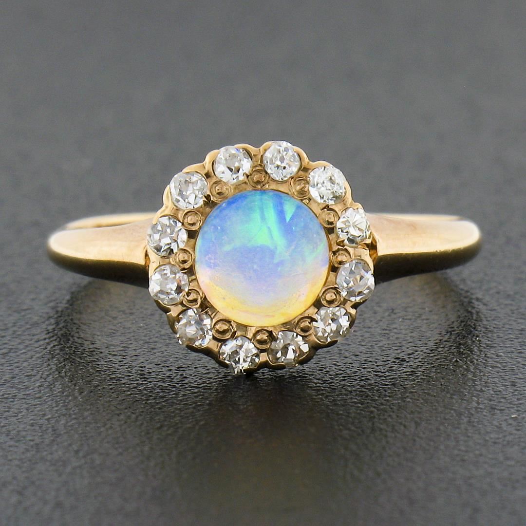 An antique solid 14k yellow gold ring, with 1 round cabochon cut natural opal (5.2mm), surrounded with a halo of 12 old mine and old single cut natural diamonds (G/H - VS2/SI1 ; 0.24ctw). The ring is size 5.0, weighs a total of 1.38 grams, and measures 8.9mm wide.