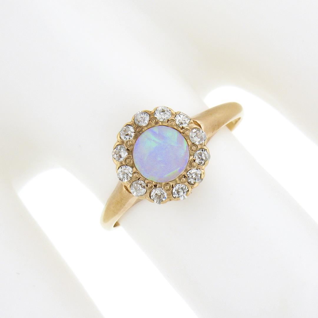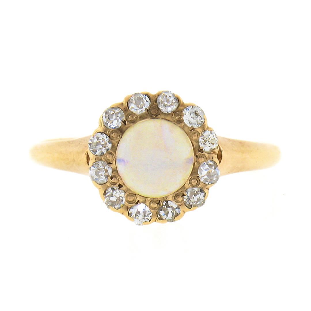An antique solid 14k yellow gold ring, with 1 round cabochon cut natural opal (5.2mm), surrounded with a halo of 12 old mine and old single cut natural diamonds (G/H - VS2/SI1 ; 0.24ctw). The ring is size 5.0, weighs a total of 1.38 grams, and measures 8.9mm wide.