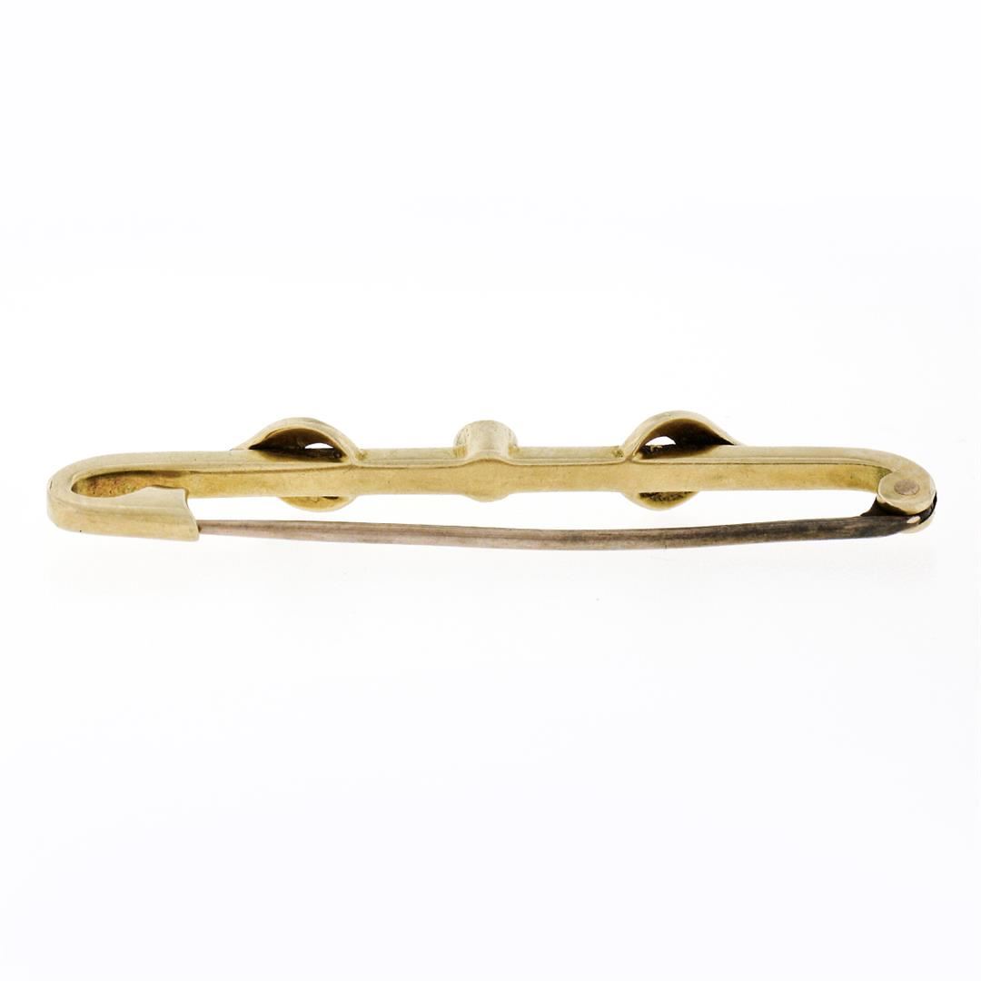 An antique solid 14k yellow gold safety pin, with 12 round bead shape natural seed pearls (1.0 to 2.65mm), and green white enamel work. Measures 44.45x5.50mm and weighs a total of 3.1 grams.