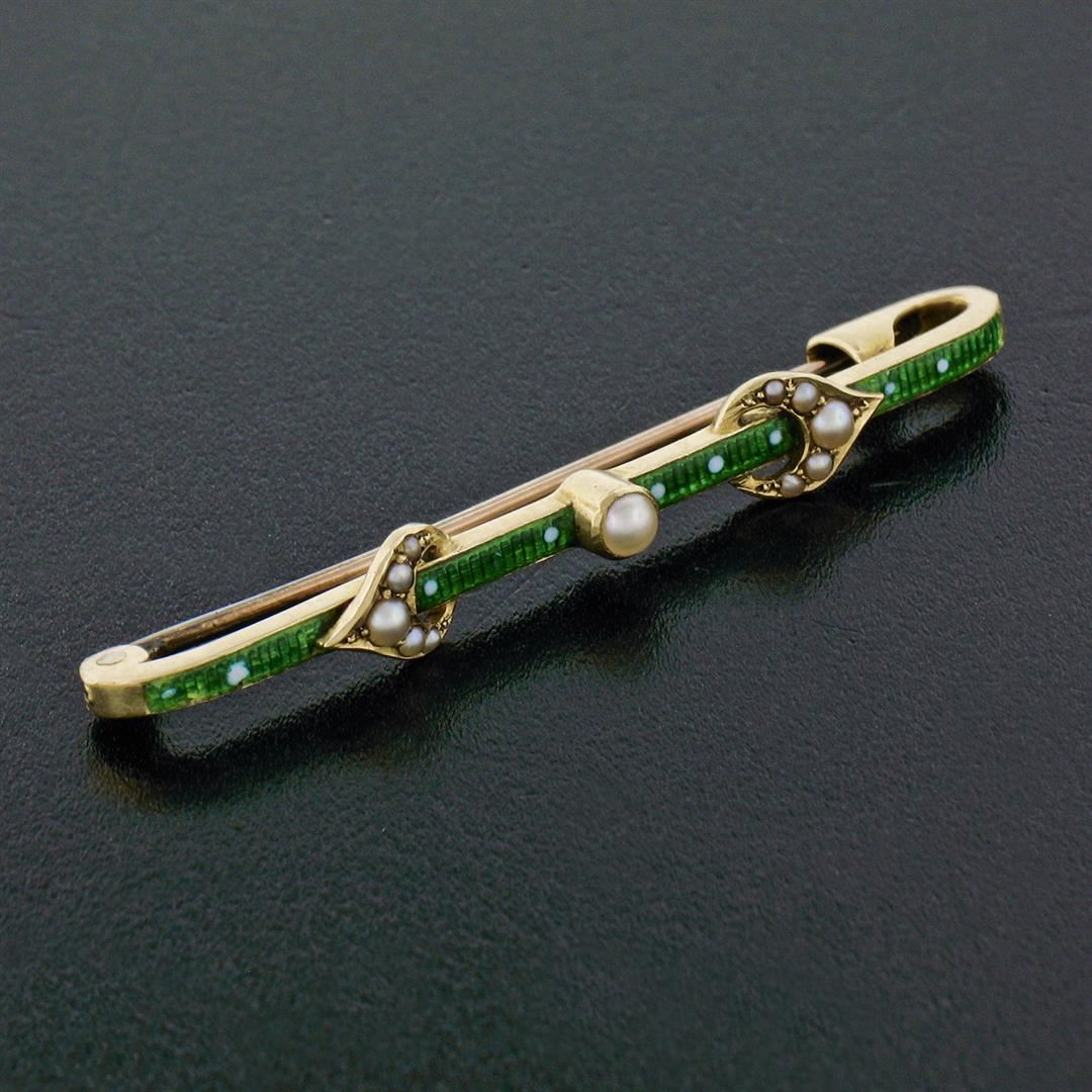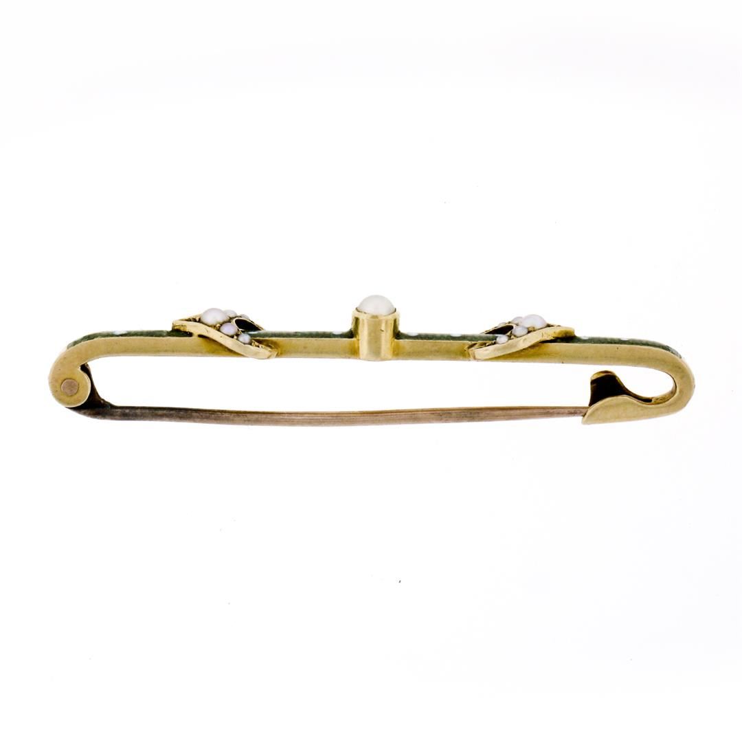 An antique solid 14k yellow gold safety pin, with 12 round bead shape natural seed pearls (1.0 to 2.65mm), and green white enamel work. Measures 44.45x5.50mm and weighs a total of 3.1 grams.