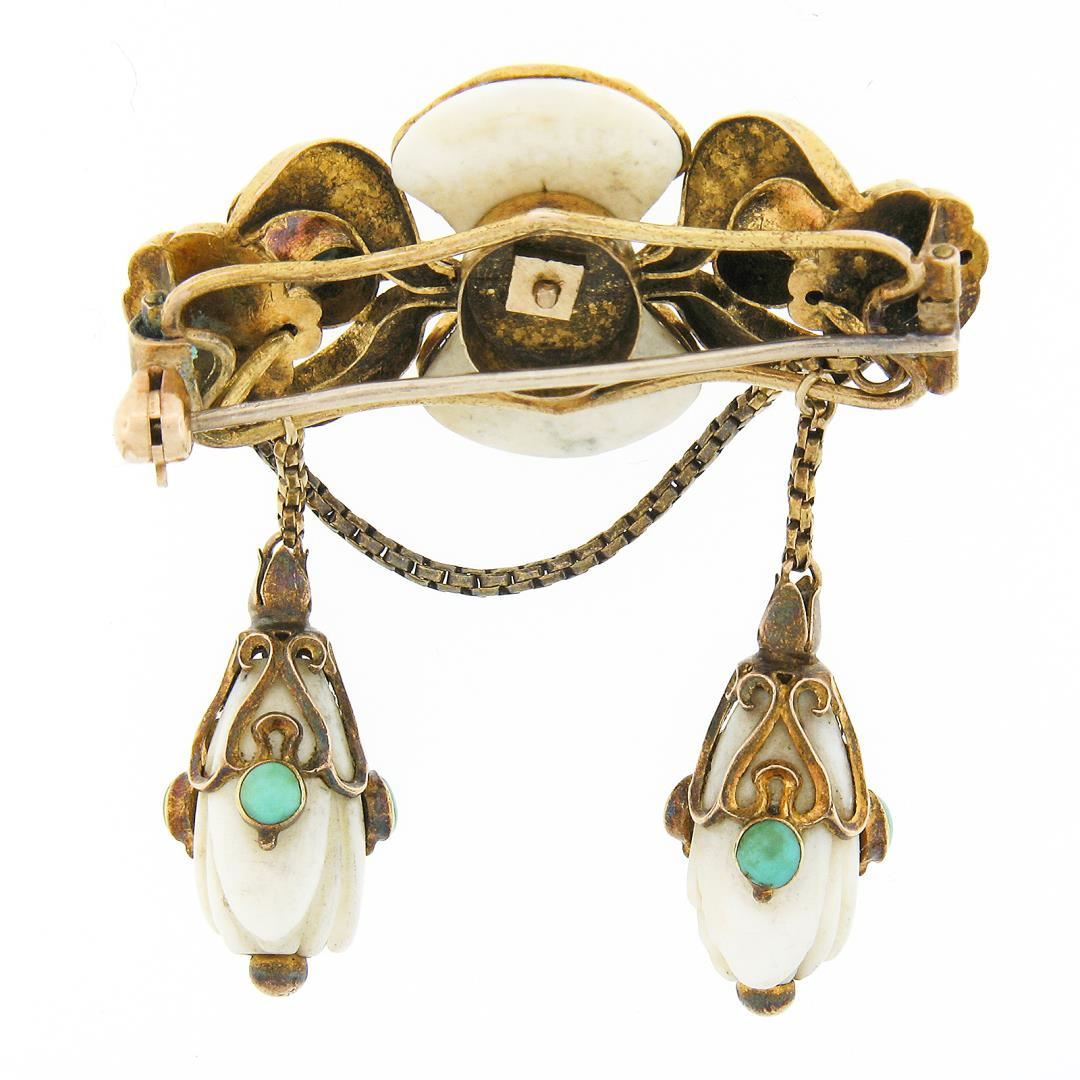 An antique solid 14k yellow gold brooch, with 13 round cabochon cut natural turquoises (4.45-2.75mm each), and 3 white stones ((1) 22x13.5mm & (2) 14.2x8mm each). Measures 48.9x40.15mm and weighs a total of 13.71 grams.