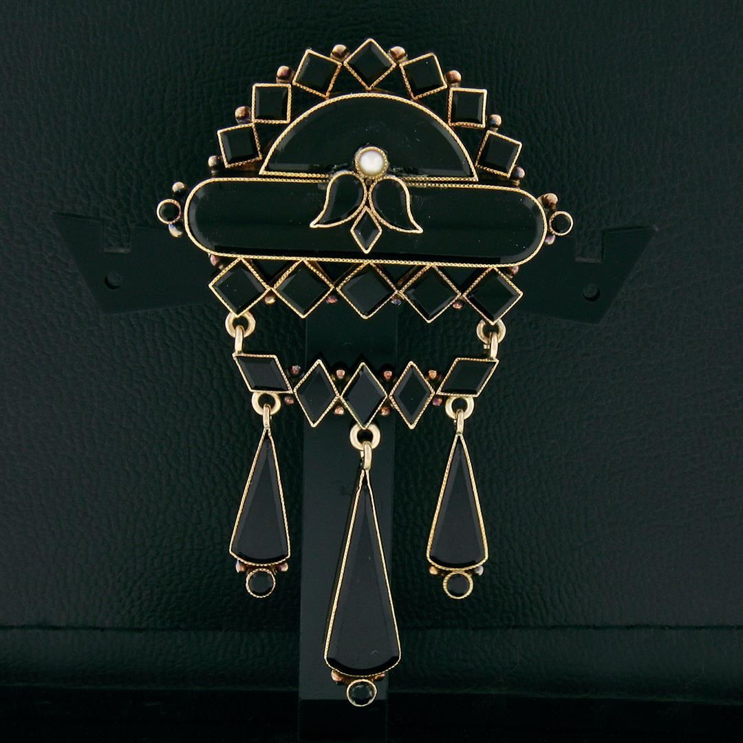 An antique solid 14k yellow gold dangle brooch, with natural balck onyx and seed pearl. Measures 65.3x39.3mm and weighs a total of 12.48 grams.