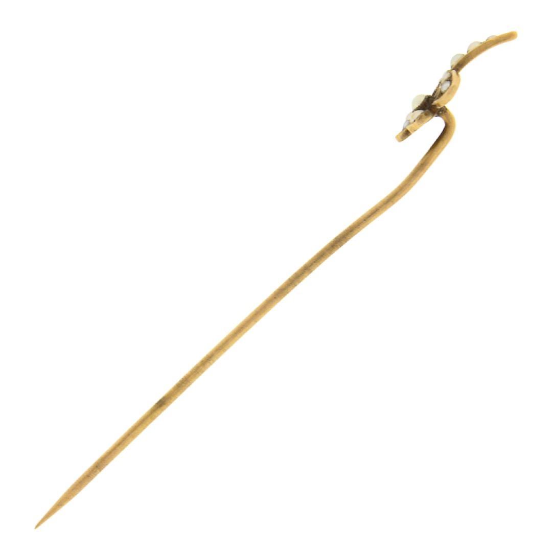 An antique solid 14k rosy yellow gold stick pin, with 12 round shape cultured seed pearls (2.6-1.3mm each ). Measures 70.6x13mm and weighs a total of 1.74 grams.