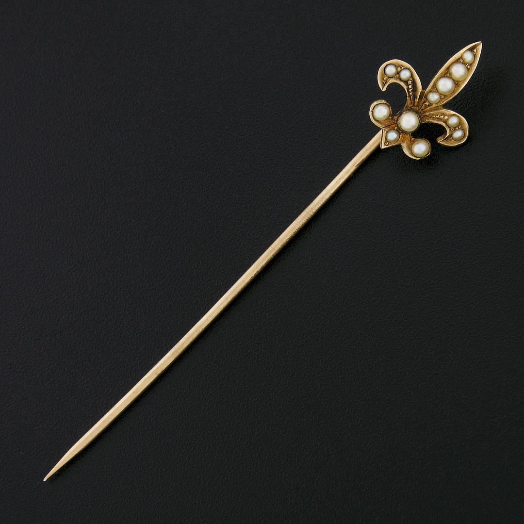 An antique solid 14k rosy yellow gold stick pin, with 12 round shape cultured seed pearls (2.6-1.3mm each ). Measures 70.6x13mm and weighs a total of 1.74 grams.