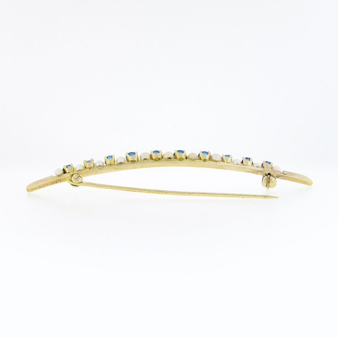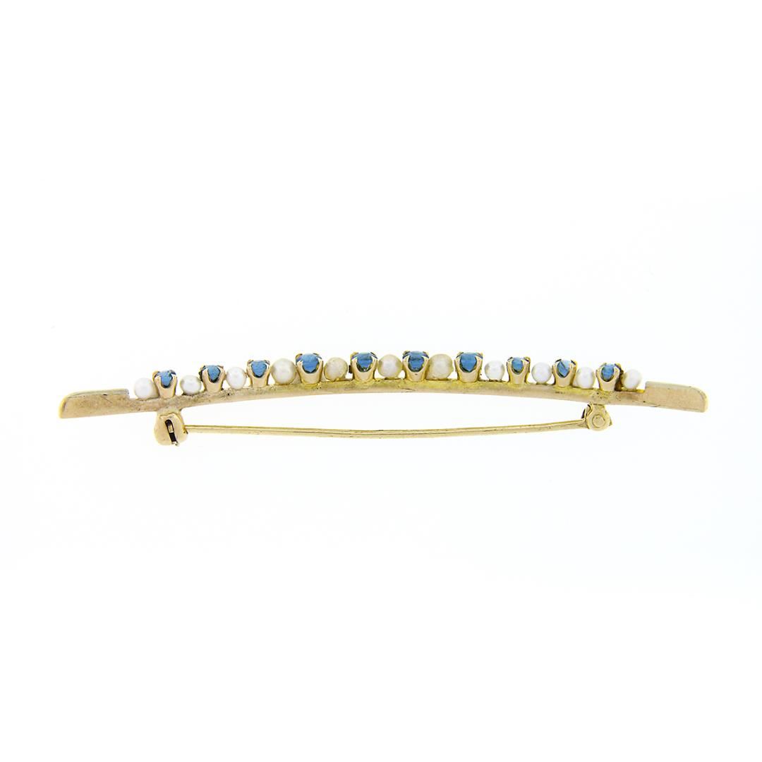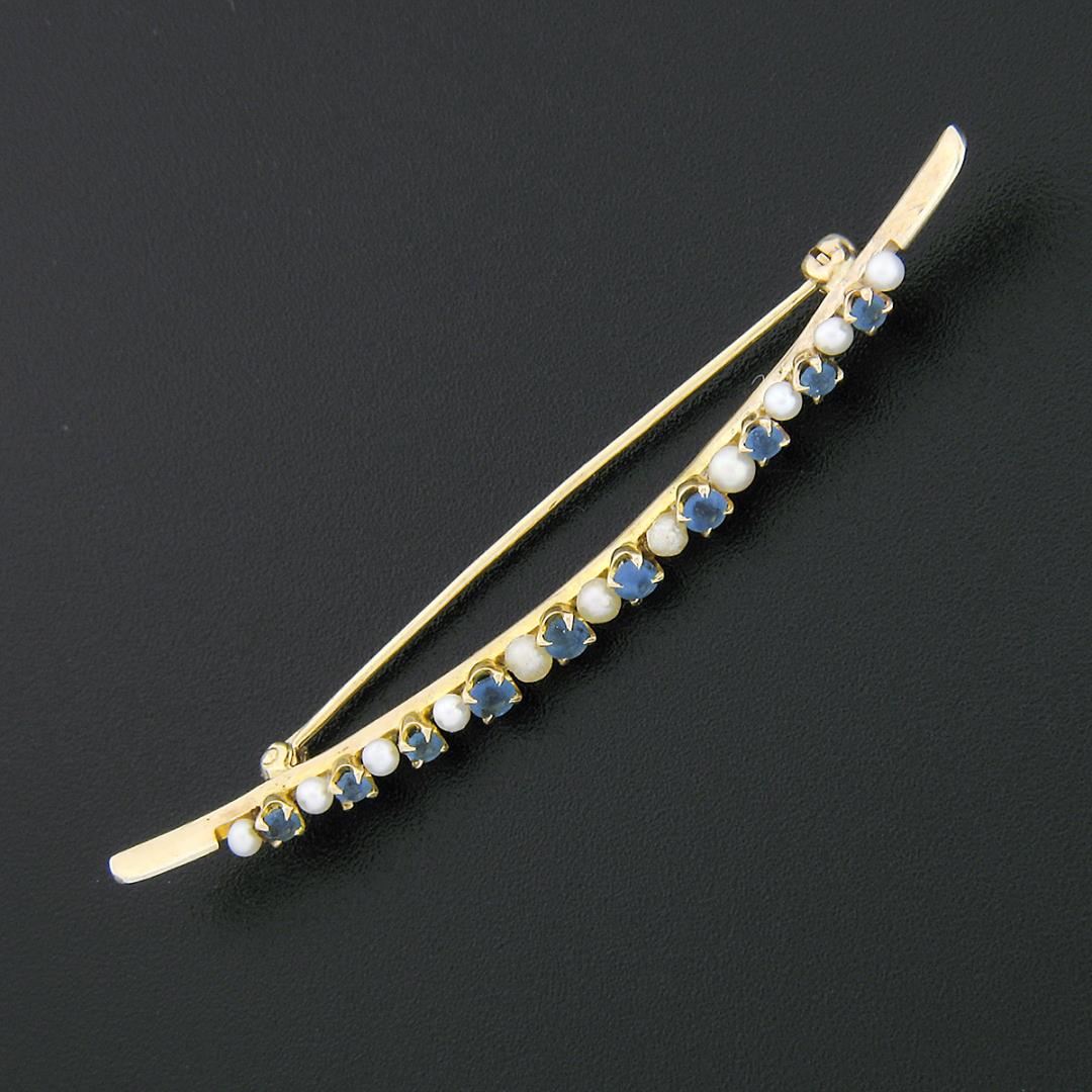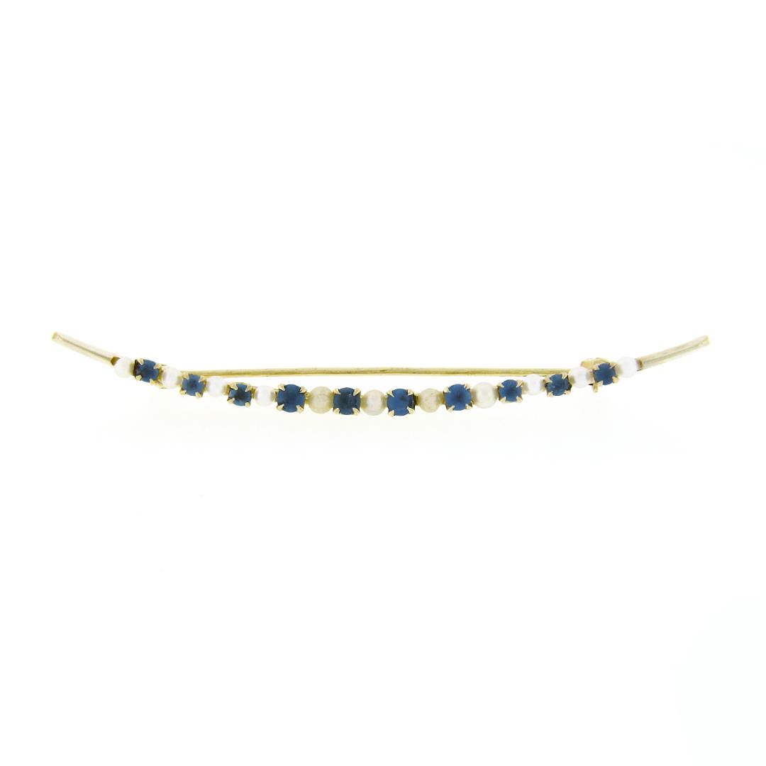 An antique solid 14k yellow gold crescent pin broch, featuring 10 old round cut blue stones (2.1mm to 2.65mm), and 11 round shape cultured seed pearls (2.2mm to 2.75mm). Measures 65.9x2.9mm and weighs a total of 3.06 grams.