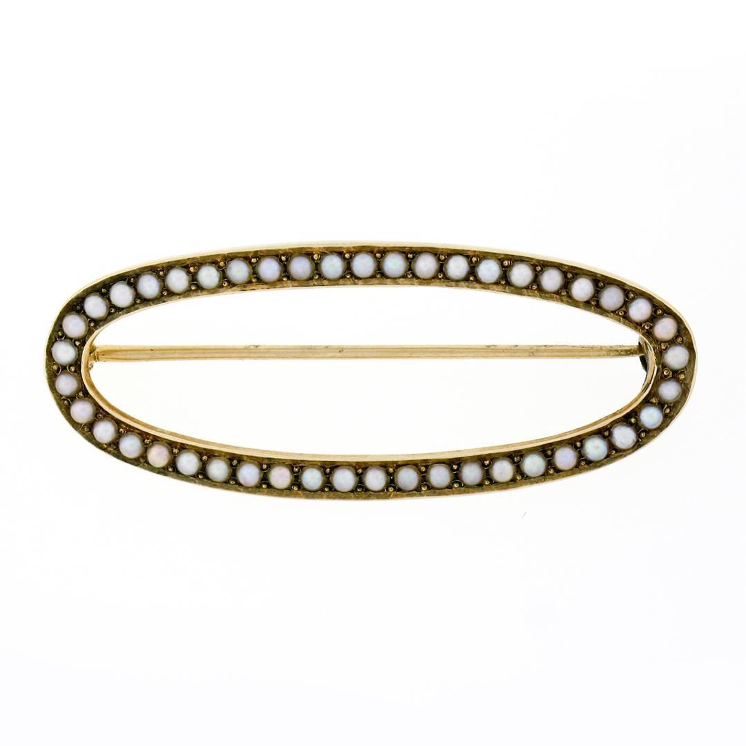 An antique solid 14k yellow gold open brooch, with 45 round shape natural seed pearls. Measures 17.6x43.2mm and weighs a total of 3.35 grams.