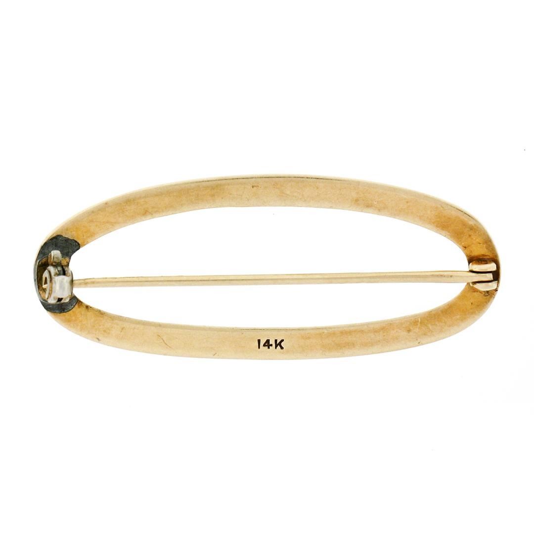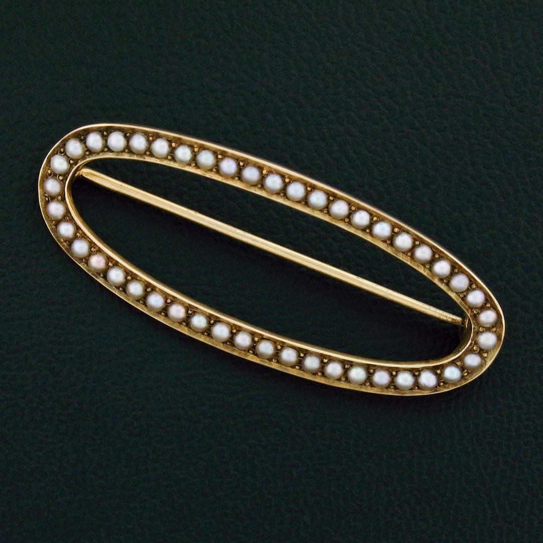 An antique solid 14k yellow gold open brooch, with 45 round shape natural seed pearls. Measures 17.6x43.2mm and weighs a total of 3.35 grams.