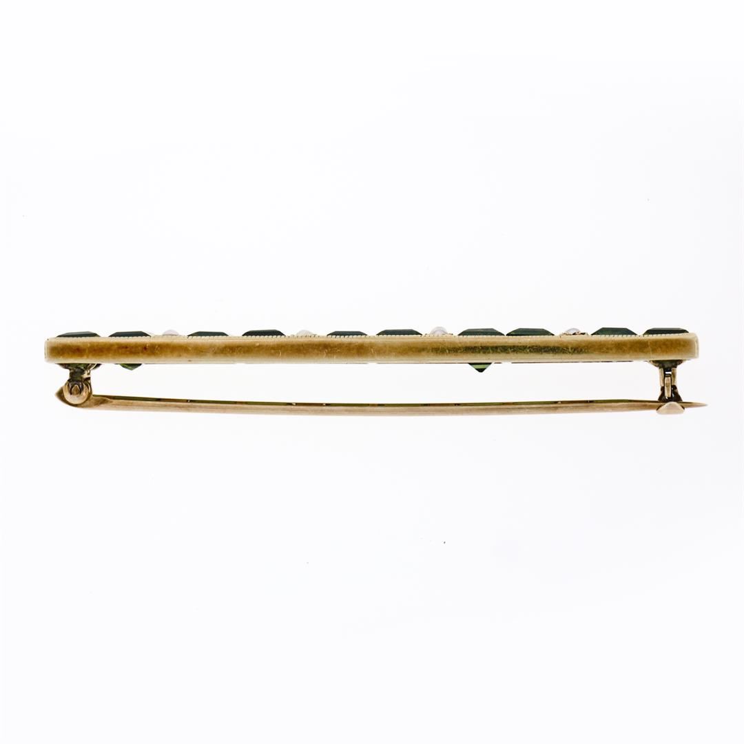 An antique solid 14k yellow gold bar pin brooch, with 10 square step cut natural toumaline (3.55ctw), and 8 round shape natural seed pearls (1.70mm). Measures 56.20x5.40mm and weighs a total of 4.92 grams.