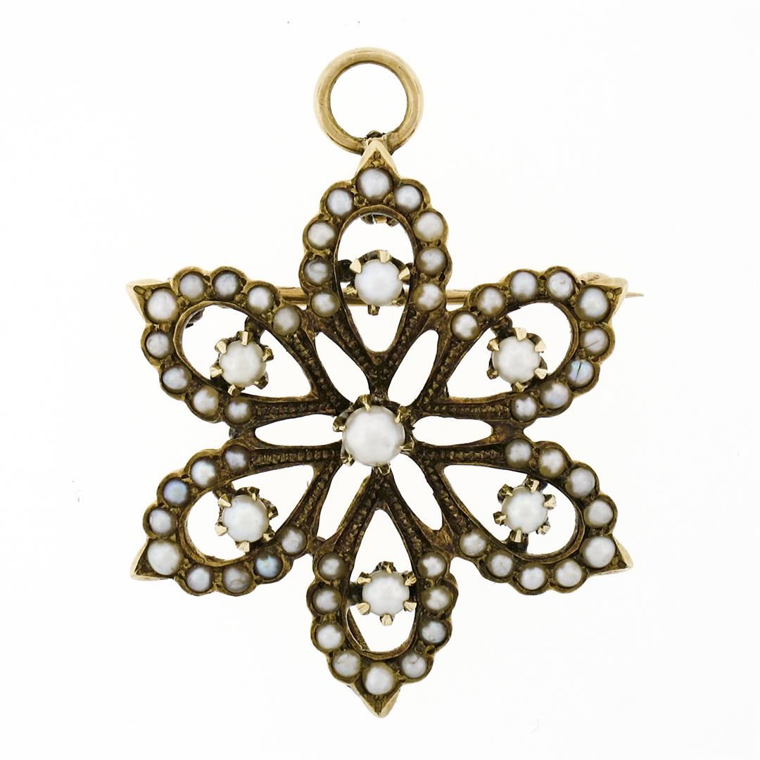 An antique solid 14k yellow gold flower brooch pendant, with 61 round shape natural seed pearls (2.0 to 3.3mm). Measures 33.85x25.65mm and weighs a total of 5.25 grams.