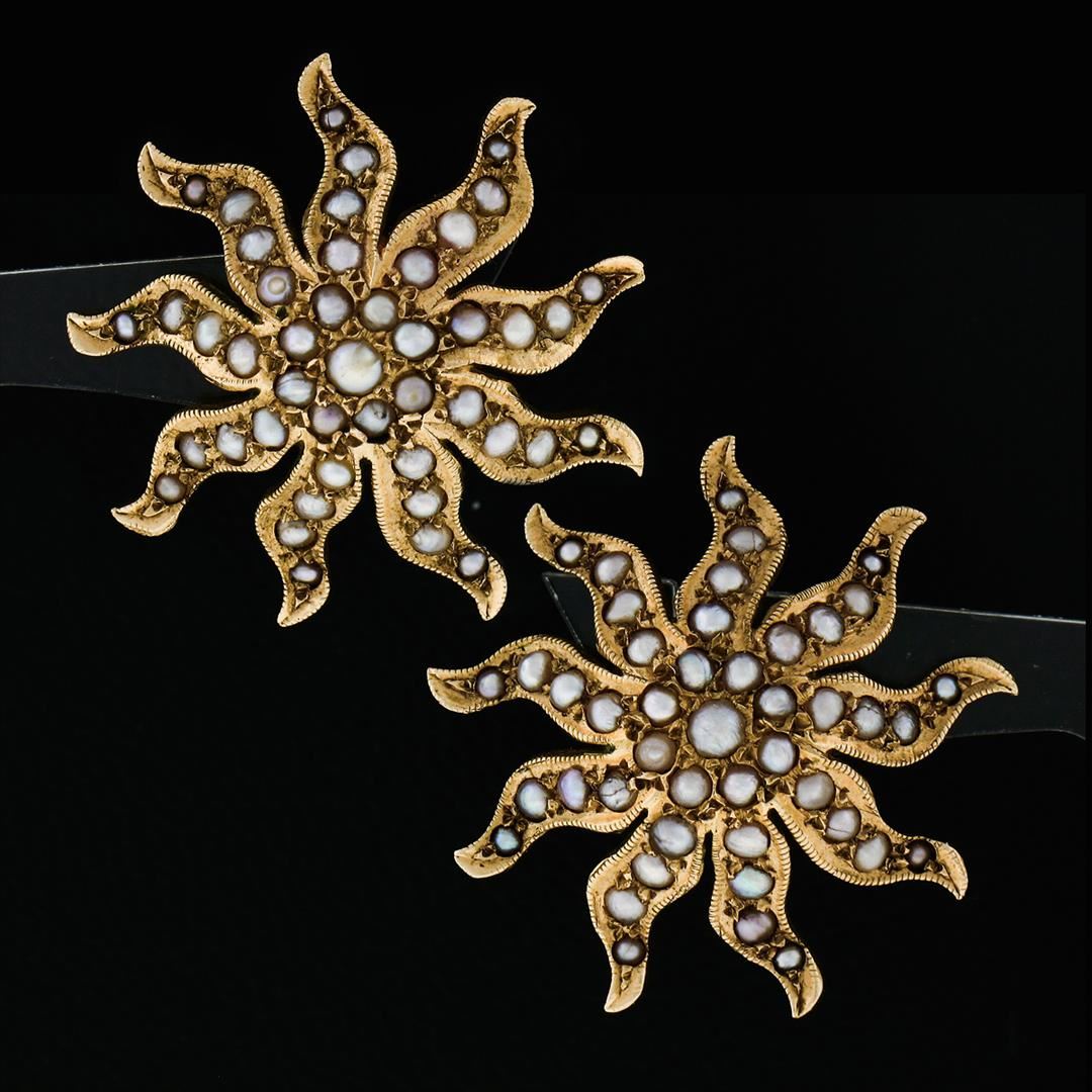 An antique solid 14k yellow gold starburst stud earrings, with 90 round bead shape natural seed pearls (1.30 to 2.50mm). The earrings measure approximately 25.45mm in diameter and weigh a total of 8.0 grams.