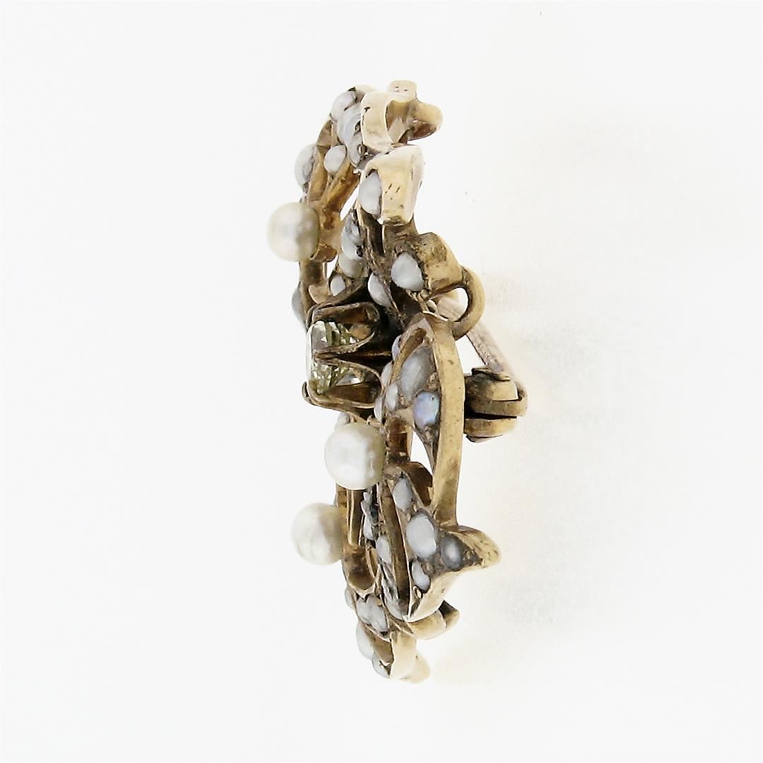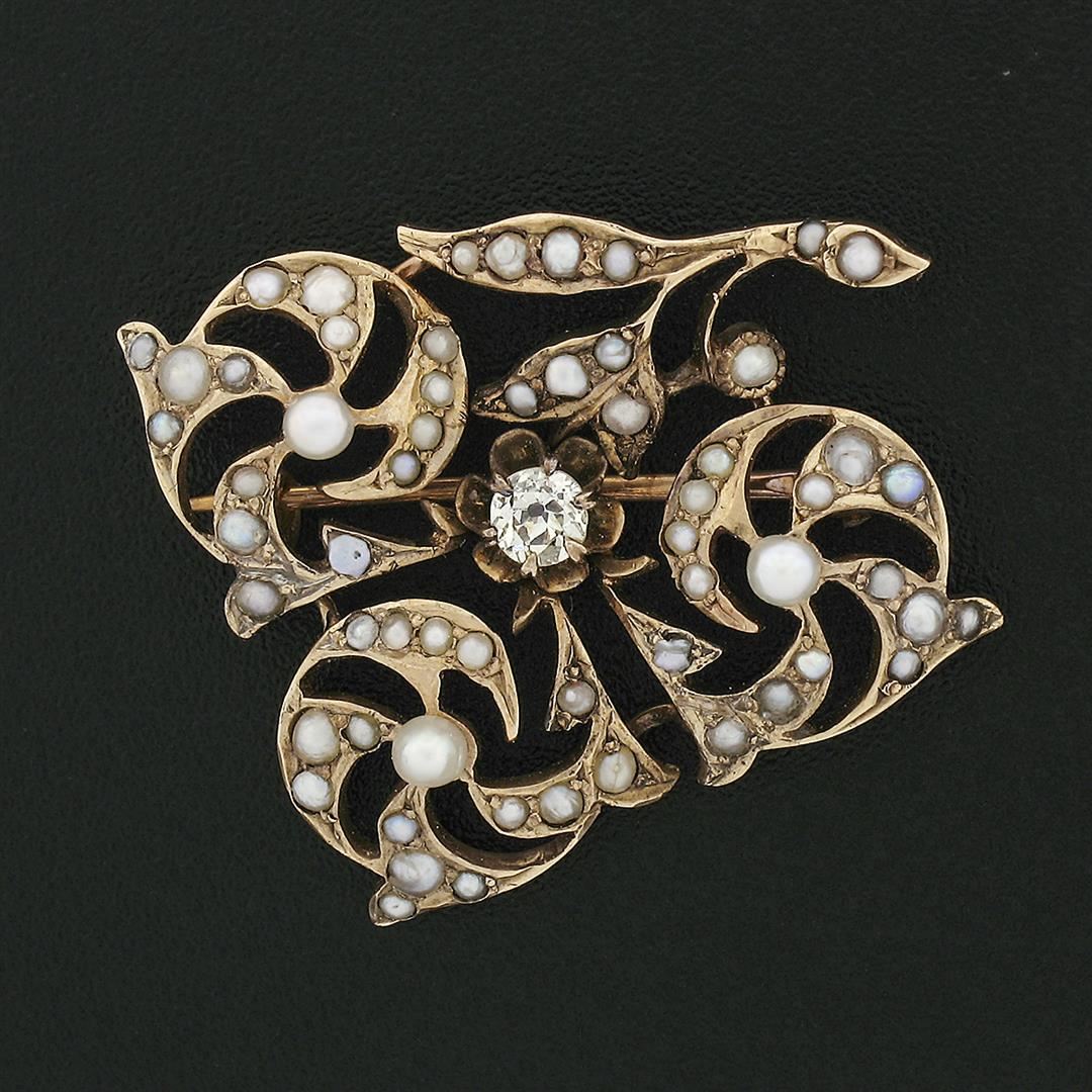 An antique victorian solid 14k yellow gold floral pin brooch,with 1 old mine cut natural diamond (VS2; K/L - 0.16ctw), surrounded with numerous of round shape cultured seed pearls. Measures 25.4x32mm and weighs a total of 4.05 grams.