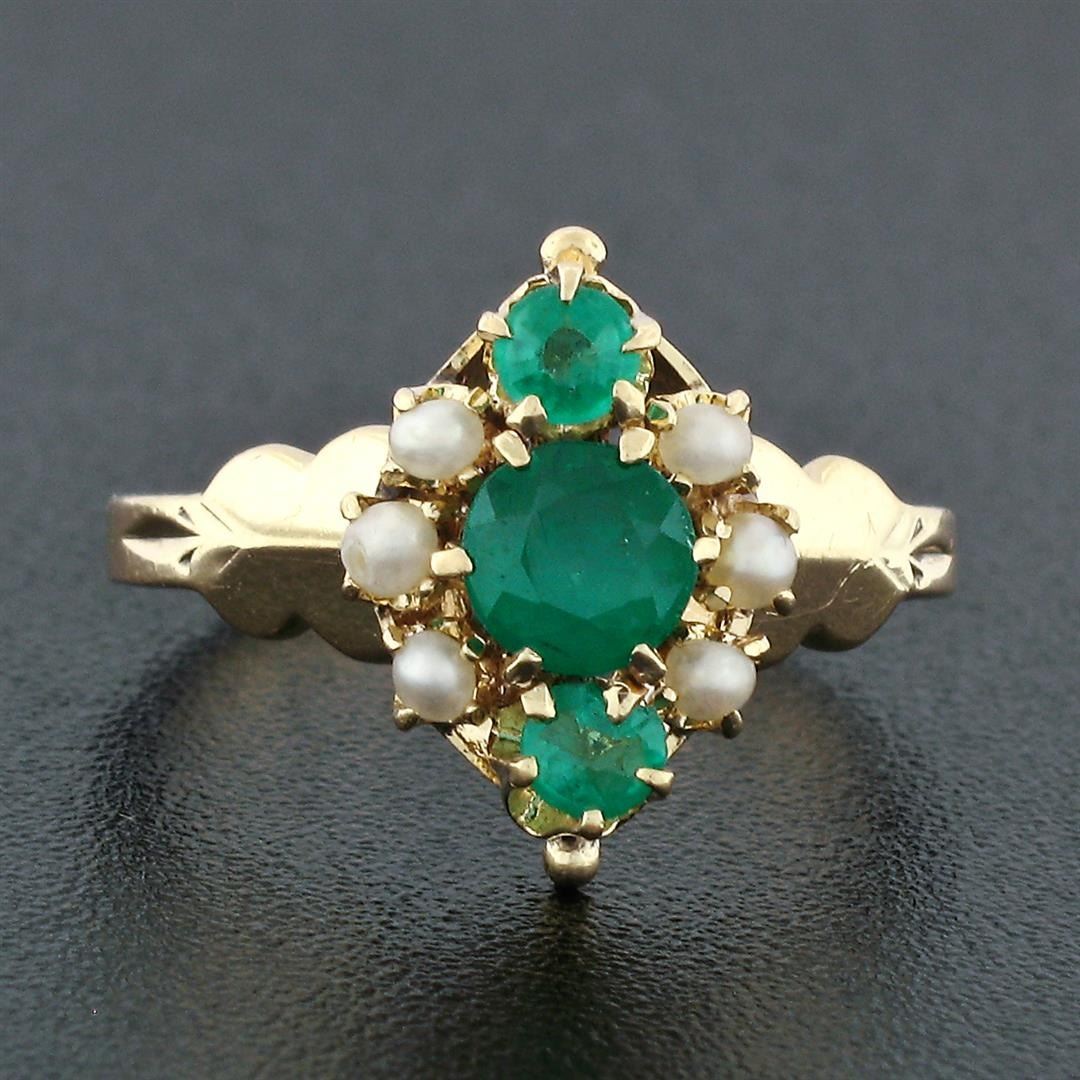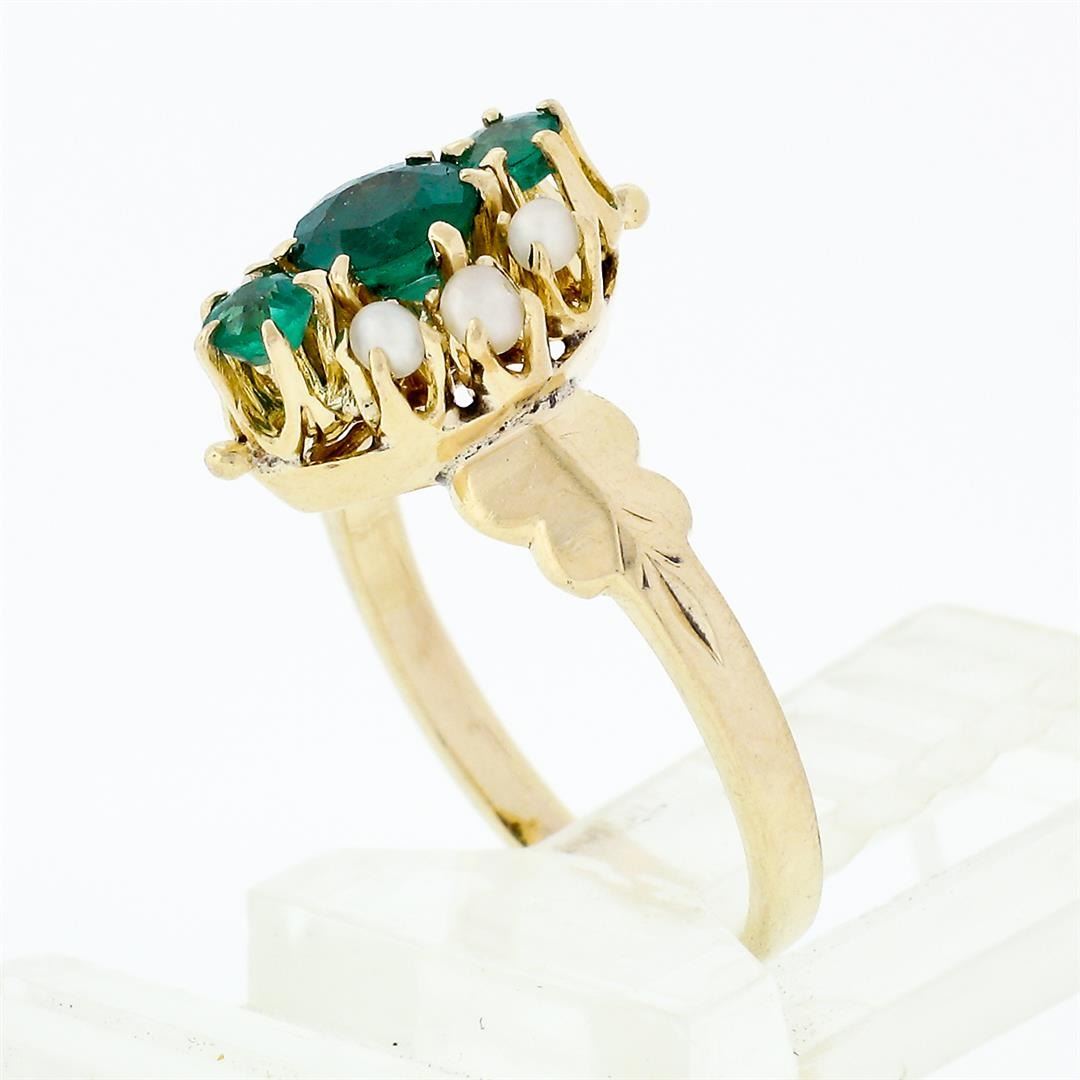 An antique solid 14k yellow gold cluster ring, 3 old round cut natural emeralds (2.56mm and 4.31mm - 0.42ctw), & 6 round shape natural pearls (1.71mm). The ring is size 3.0, weighs a total of 1.98 grams, and measures 12.19mm wide.
