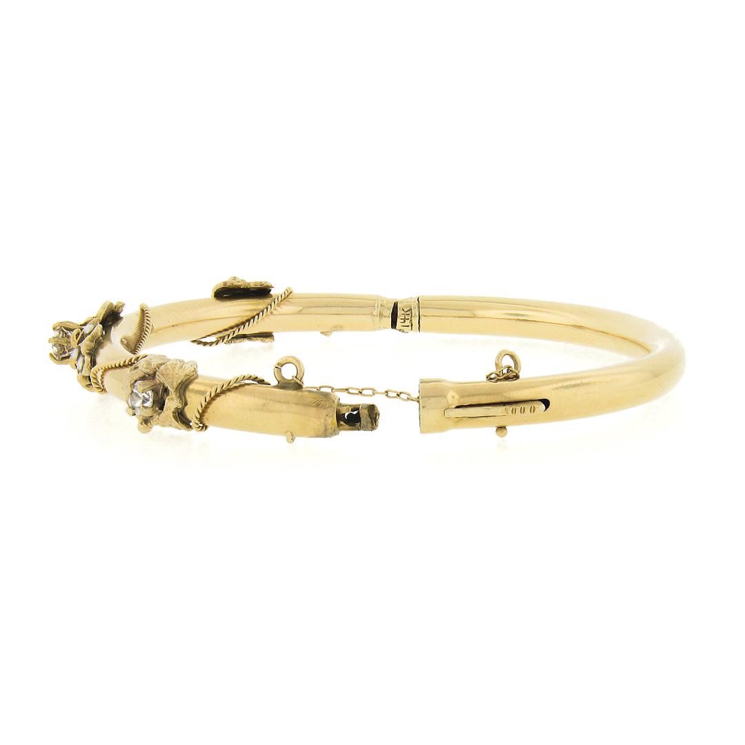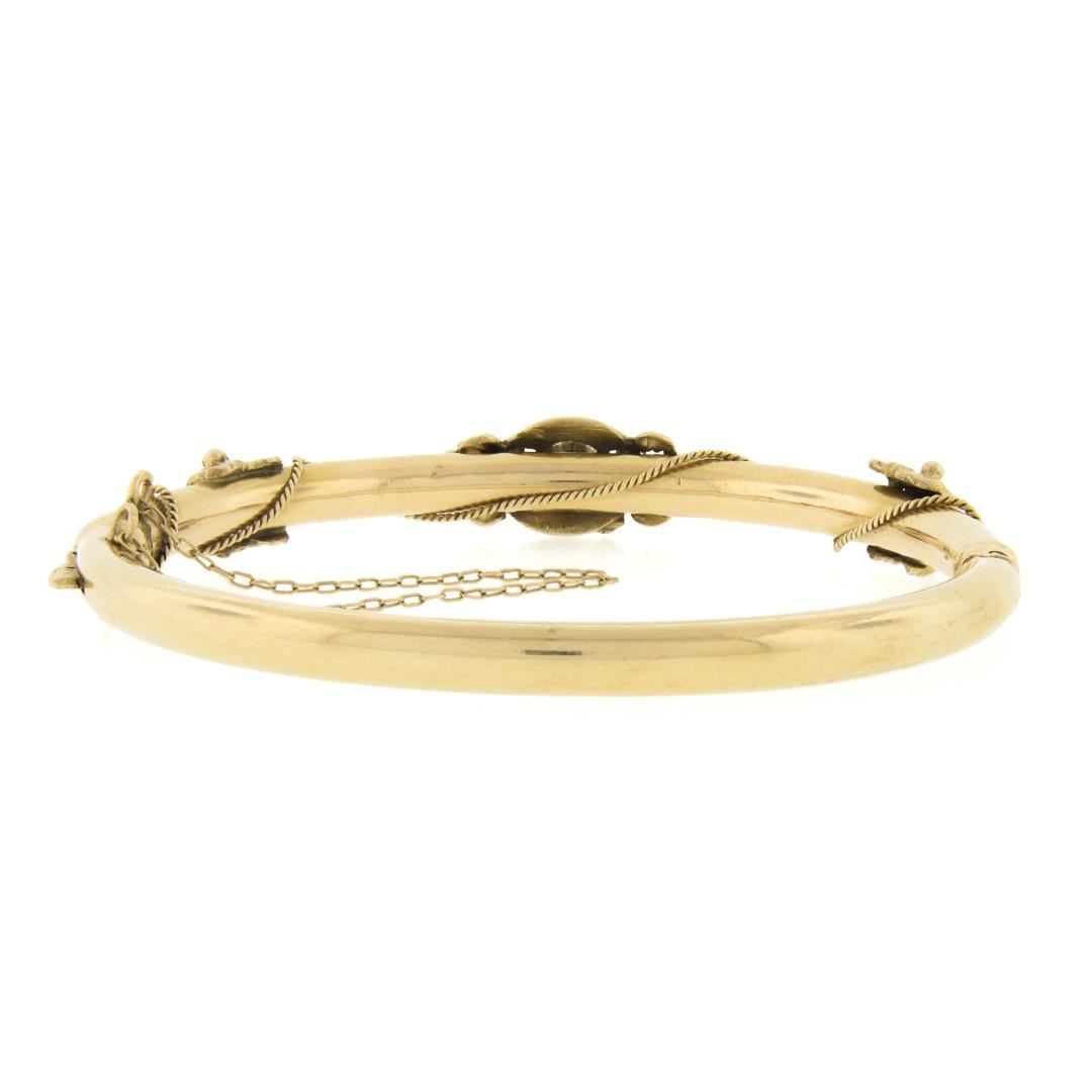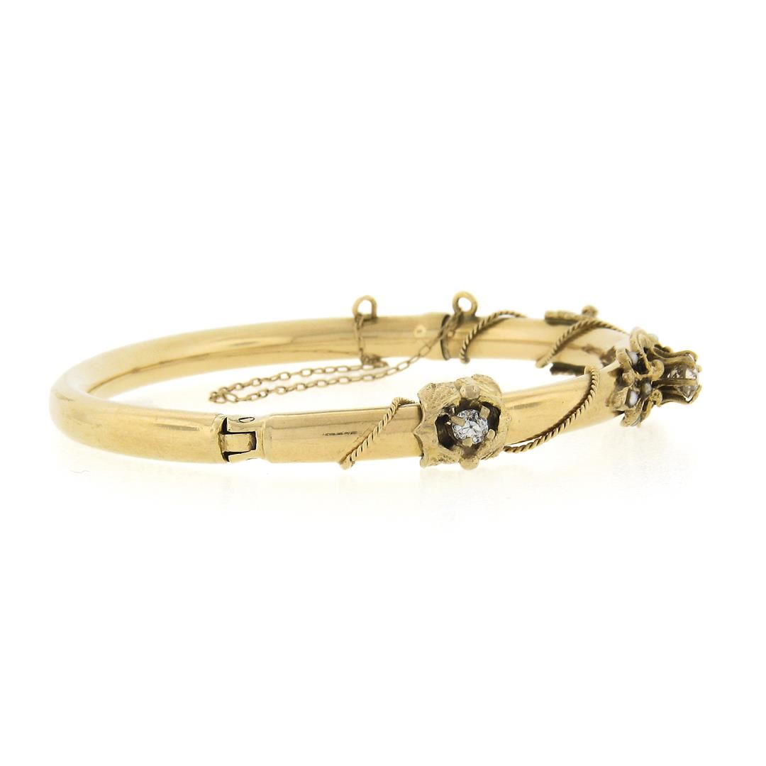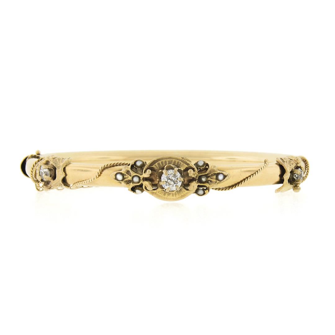 An antique solid 14k yellwo gold hinged bracelet, with 3 old european cut natural diamonds (H/I - VS2/SI1 ; 0.50ctw ), and 8 round shape cultured seed pearls (1.60mm each ). It weighs a total of 14.80 grams, measures 9.35mm wide, and measures 6.5 inches in length.