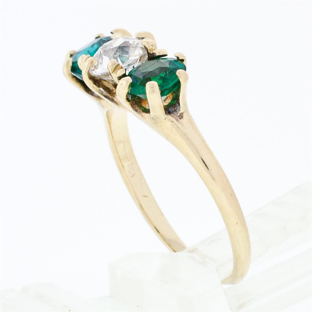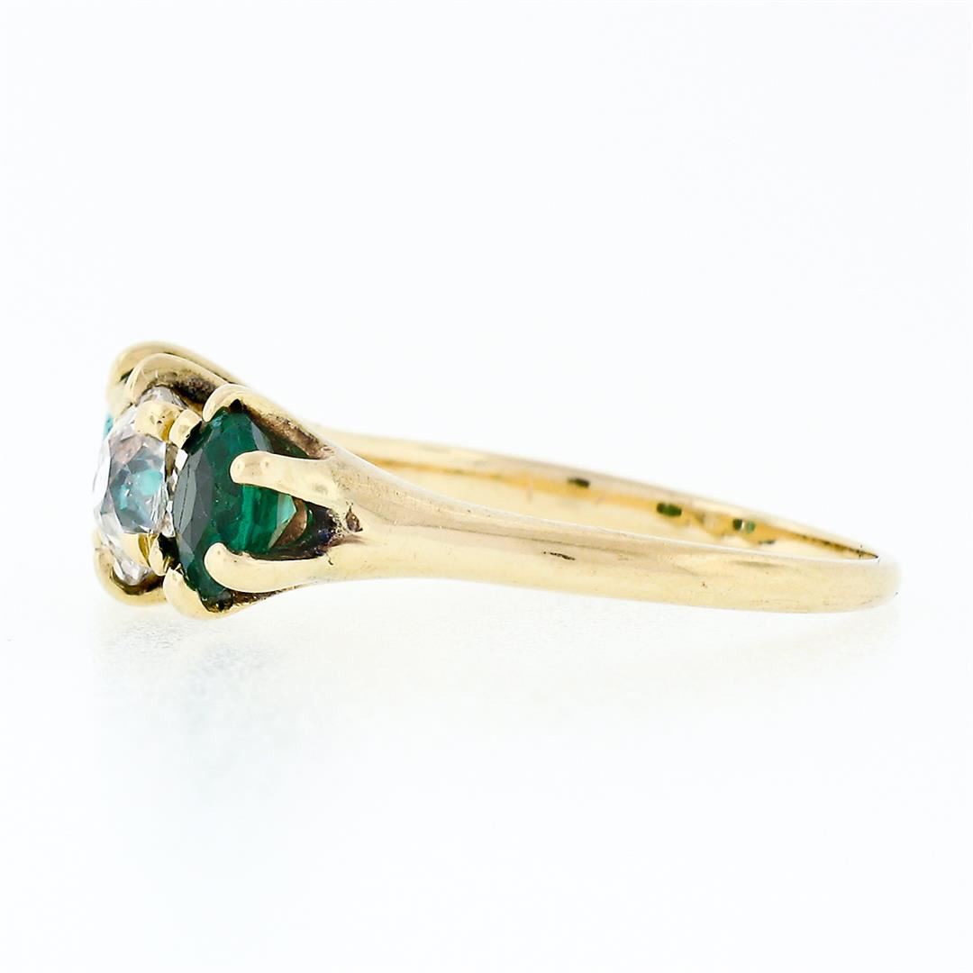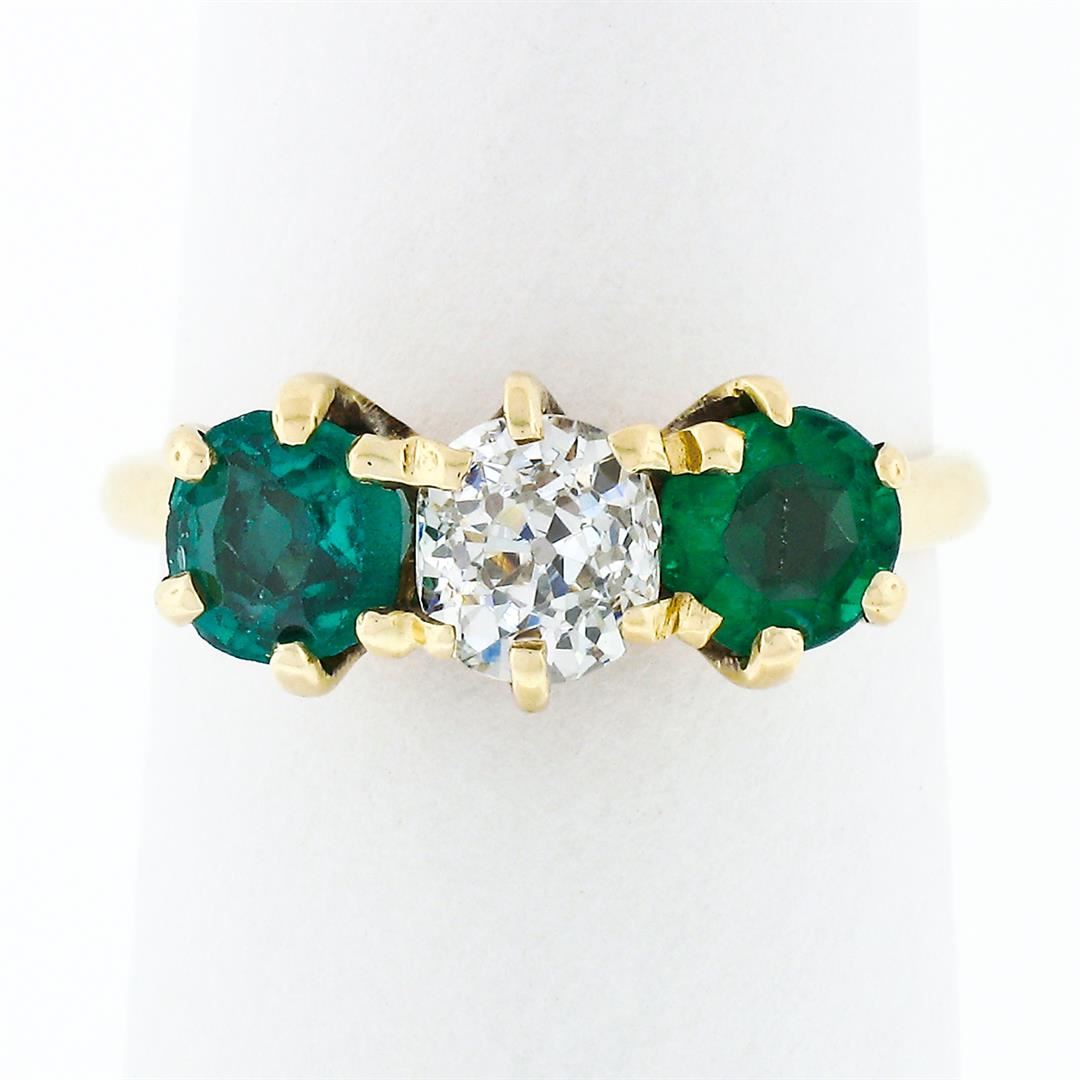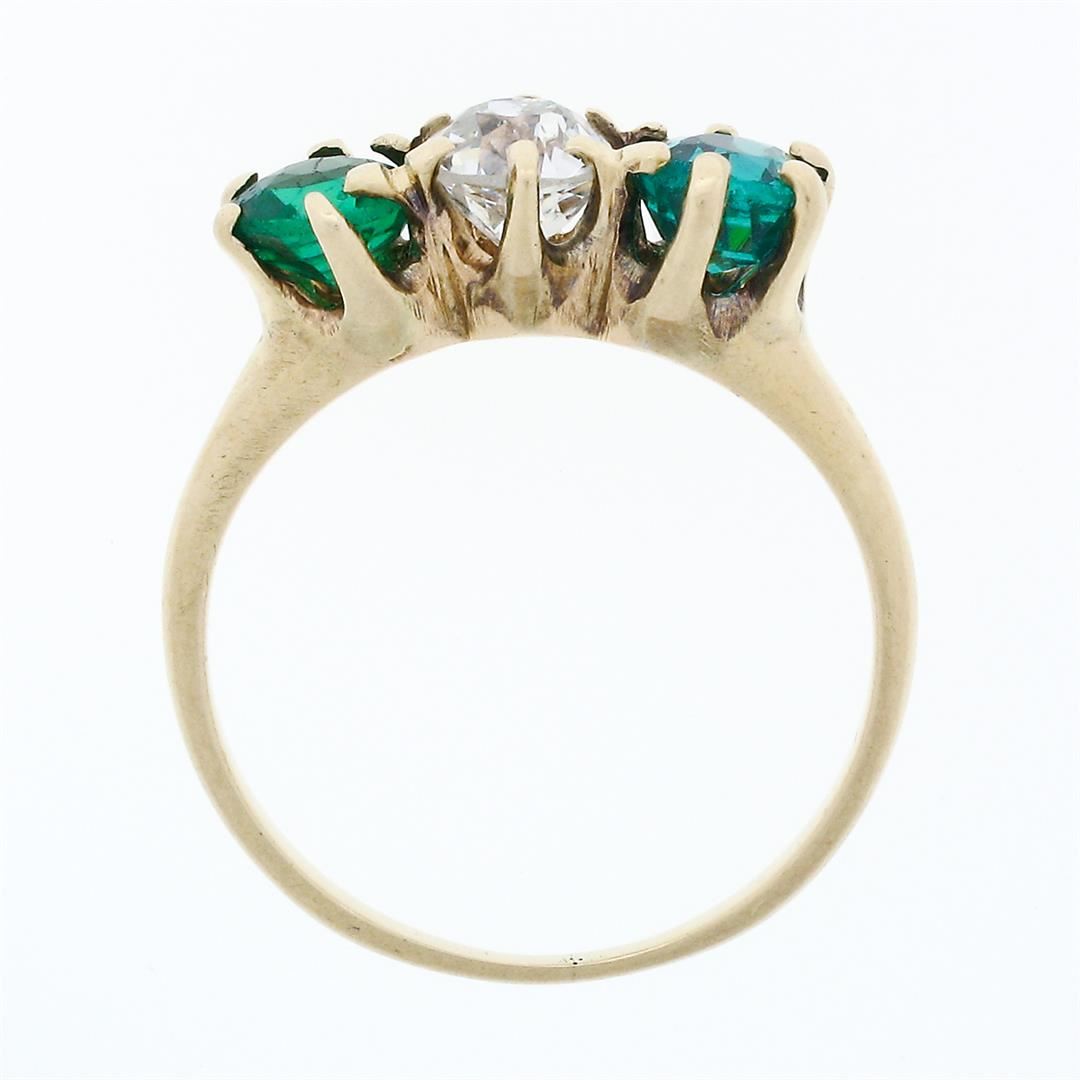 An antique solid 14k yellow gold 3 stones band ring, with 1 old mine cut natural diamond (H- VS1; 0.65ct ), and 2 old round cut green stones (4.8x5.1mm). The ring is size 6.0, weighs a total of 2.67 grams, and measures 6.87mm wide.