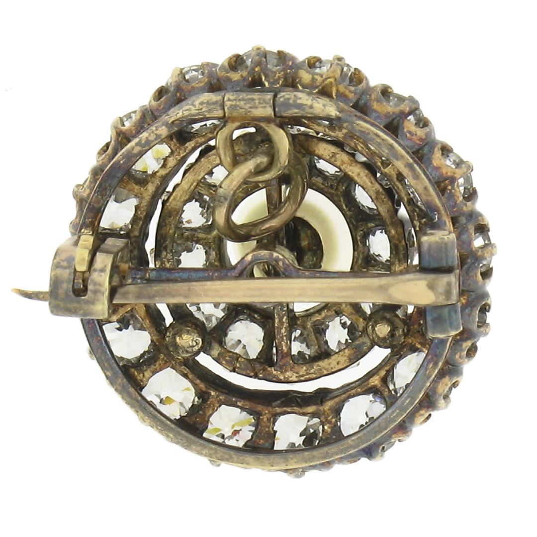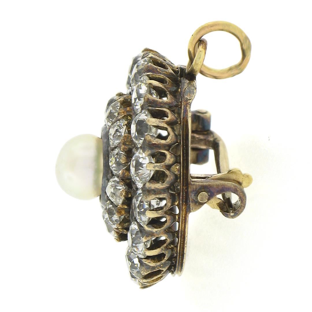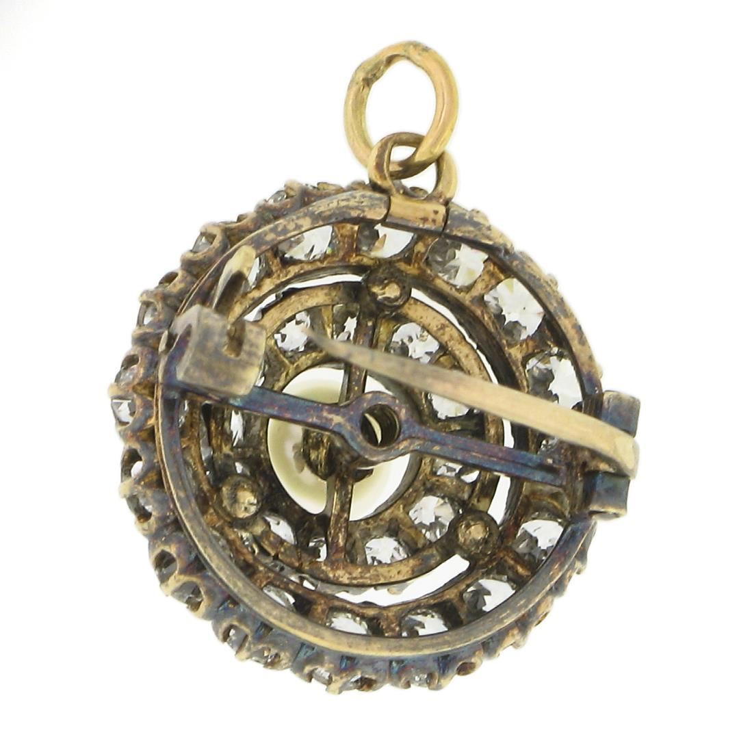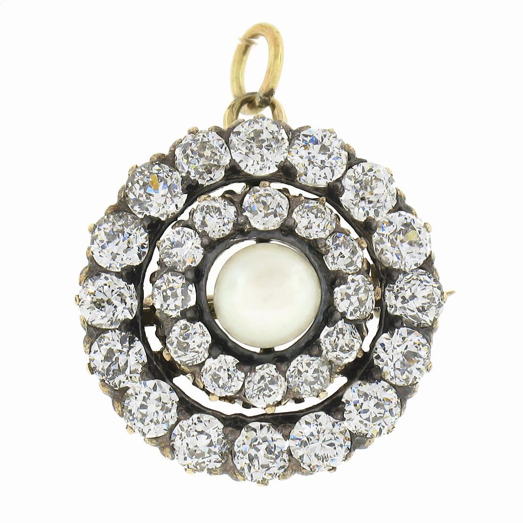 An antique solid 14k yellow gold pendant brooch, with 1 semi round shape cultured pearl (5.2mm), surrounded with dual halo of 28 old mine & old European cut natural diamonds (G/H - VS1/VS2 ; 2.20ctw ). Measures 23x18.4mm and weighs a total of 3.80 grams, and the inside bail measurements 2.9mm