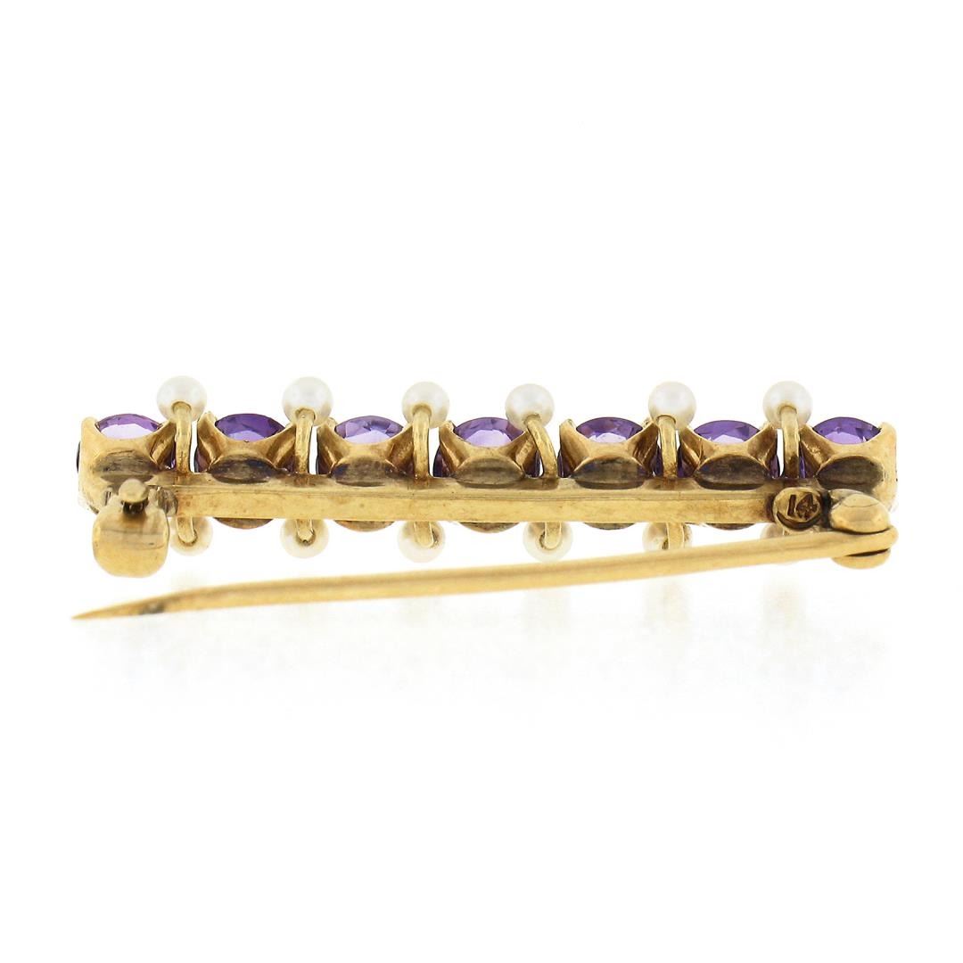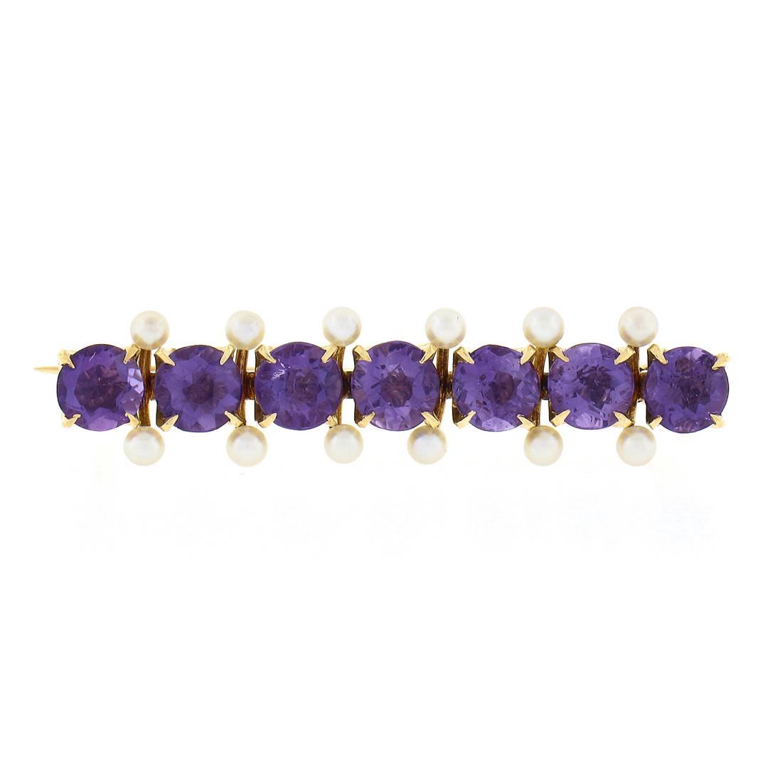 An antique solid 14k yellow gold bar brooch, with 7 old round cut natural amethysts(4.2mm each), and 12 round shape cultured seed pearls (1.9mm to 2mm each). Measures 7.55x31.80mm and weighs a total of 3.23 grams.
