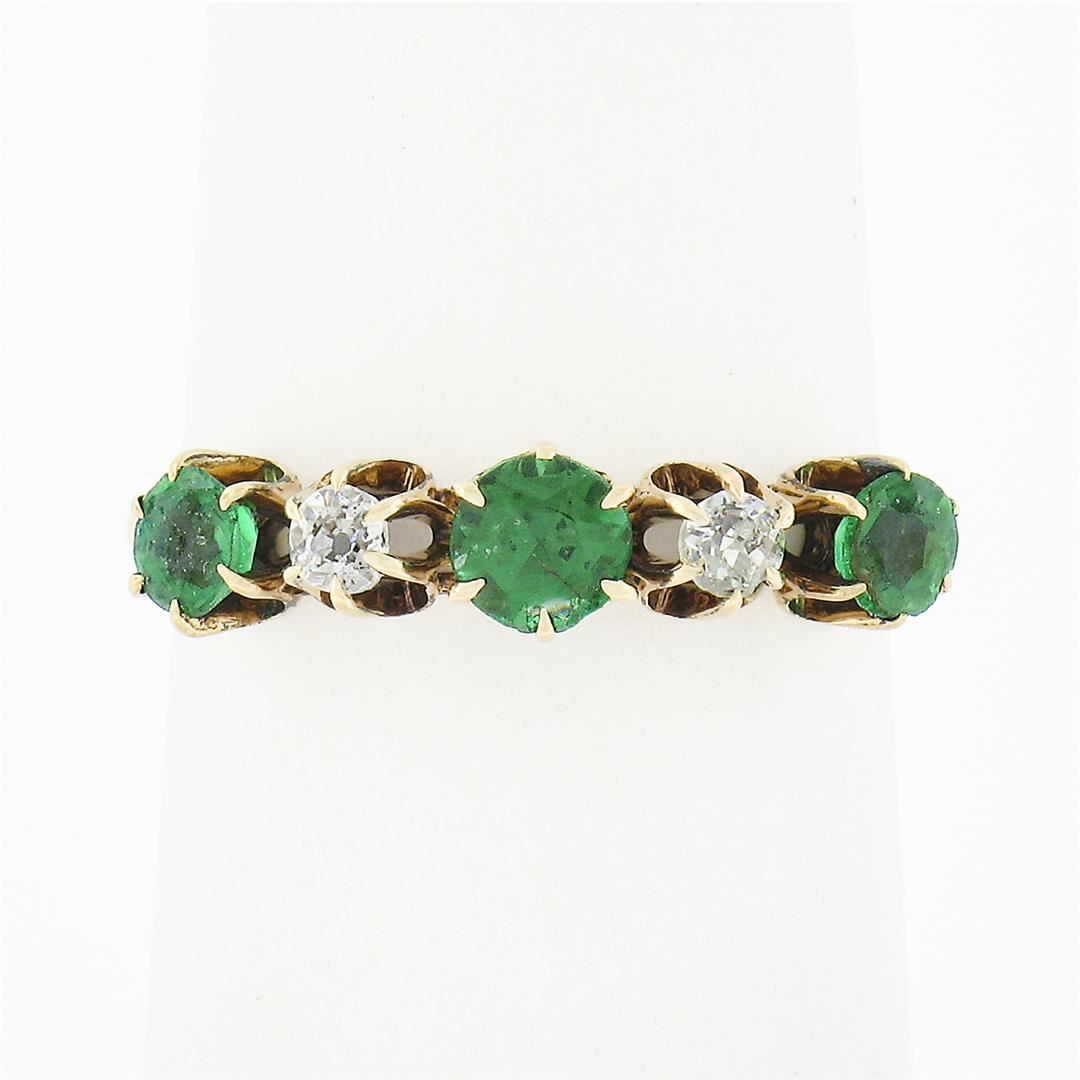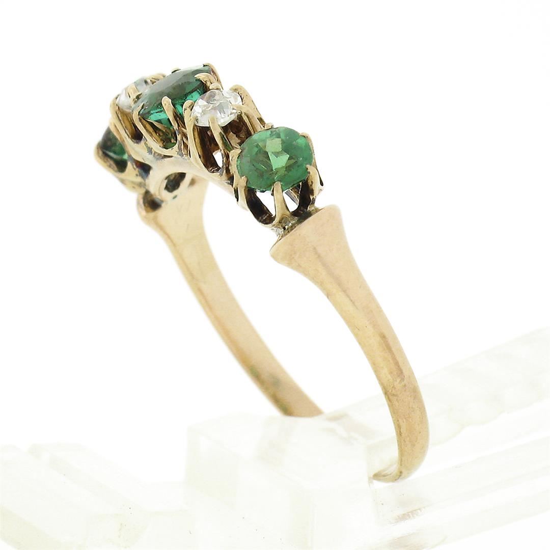An antique solid 14k yellow gold band ring, with 3 round cut natural tsavorites (0.58ctw), and 2 old mine cut natural diamonds (G/H - SI1/SI2 ; 0.12ctw). The ring is size 6.5, weighs a total of 1.60 grams, and measures 4.55mm wide.
