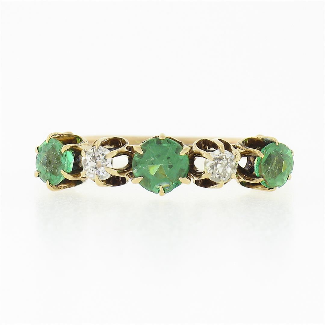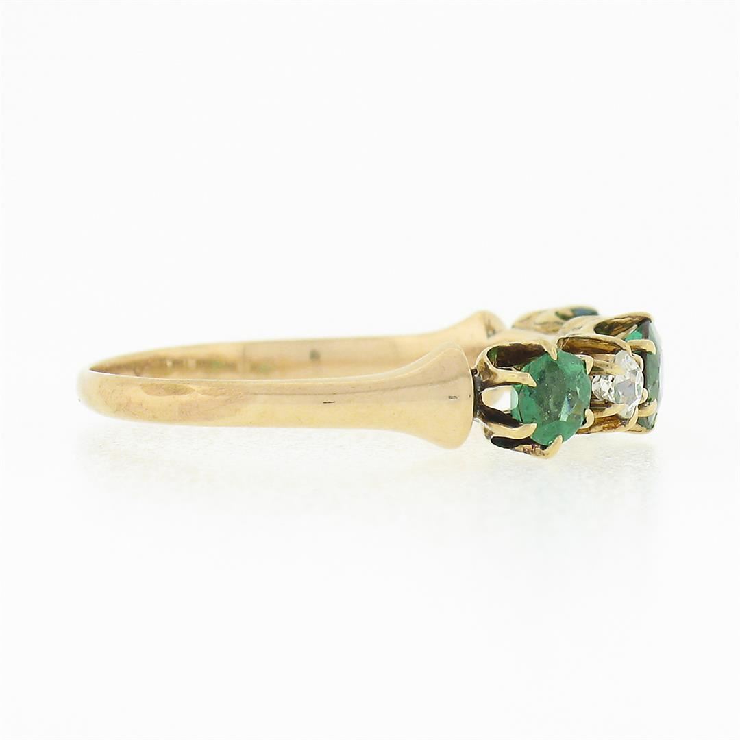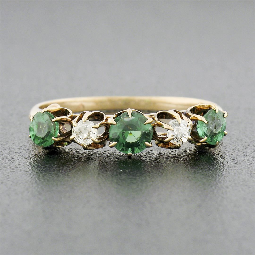 An antique solid 14k yellow gold band ring, with 3 round cut natural tsavorites (0.58ctw), and 2 old mine cut natural diamonds (G/H - SI1/SI2 ; 0.12ctw). The ring is size 6.5, weighs a total of 1.60 grams, and measures 4.55mm wide.