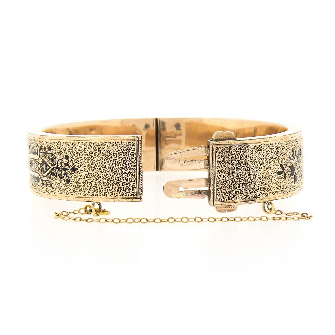 An antique Victorian solid 14k yellow gold bangle bracelet, with black enamel work. It weighs a total of 23.62 grams, measures 13.20mm wide, and measures 6.25 inches in length.