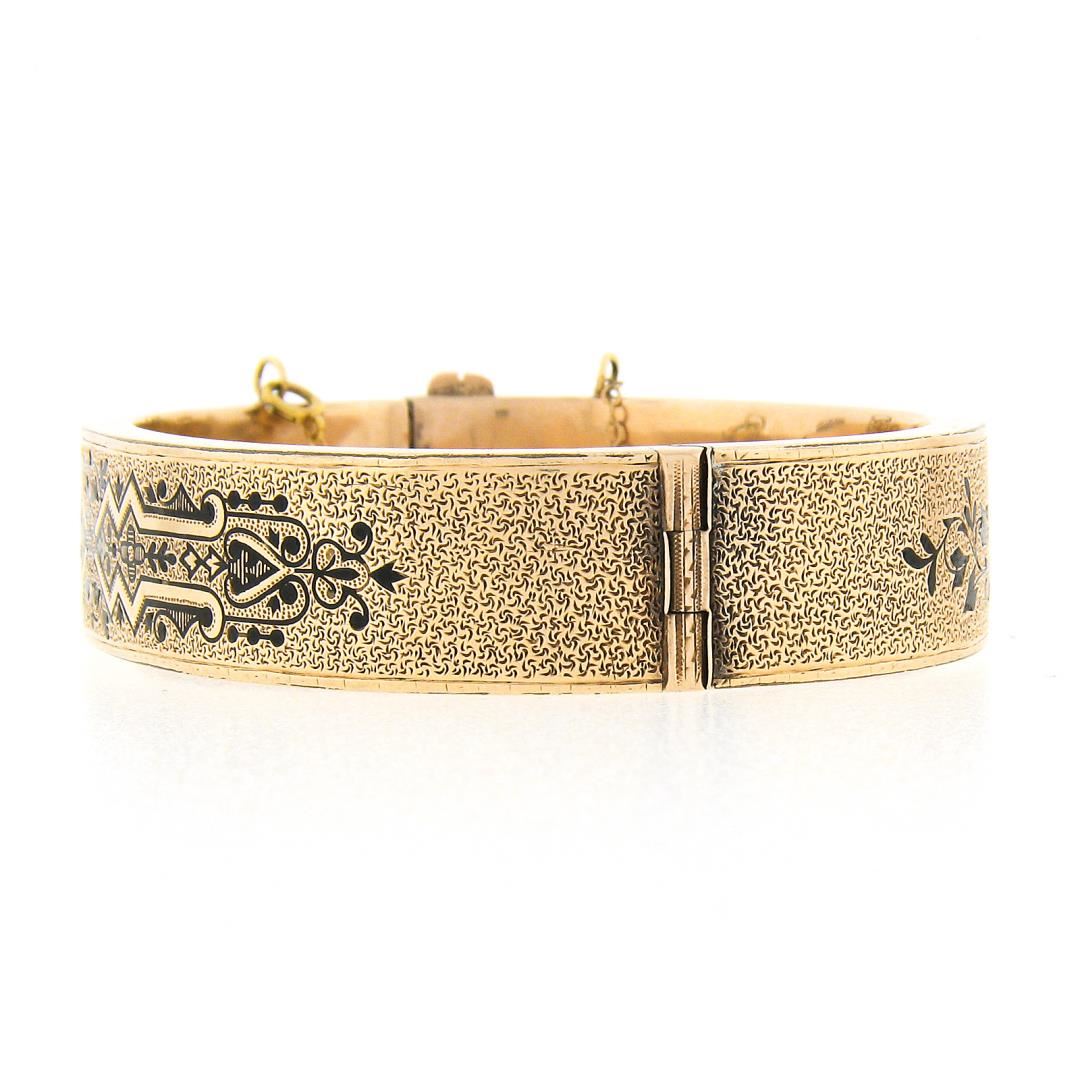 An antique Victorian solid 14k yellow gold bangle bracelet, with black enamel work. It weighs a total of 23.62 grams, measures 13.20mm wide, and measures 6.25 inches in length.