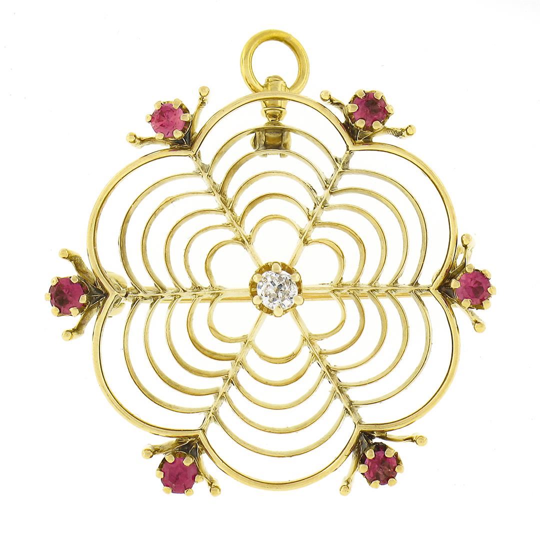 An antique solid 14k yellow gold pin brooch pendant, with 6 round brilliant cut red stones (2.35mm each), and 1 old mine cut natural diamond (H - VS2 ; 0.10ct). Measures 31.80x33.15mm and weighs a total of 5.59 grams.