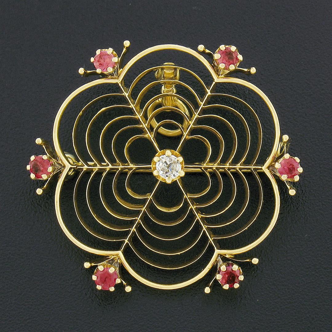 Antique Victorian 14k Gold Diamond Red Stone Spider Web Open Brooch Pin Pendant