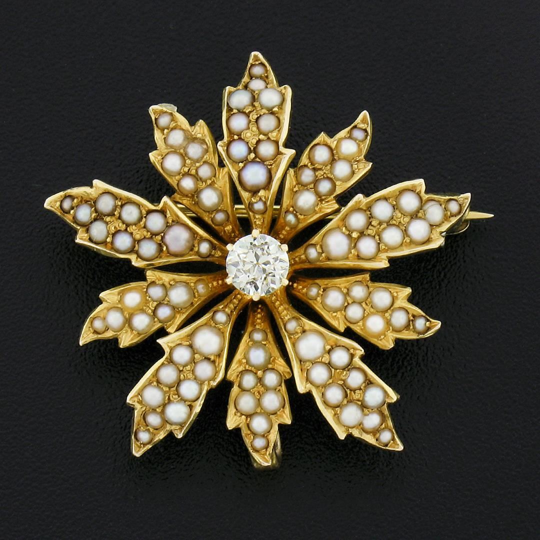 An antique solid 14k yellow gold brooch pendant, with 1 old European cut natural diamond (H - SI1 ; 0.25ctw ), and 90 round shape cultured seed pearls (1mm to 2.2mm each). Measures 26.7x27.3mm and weighs a total of 4.87 grams.