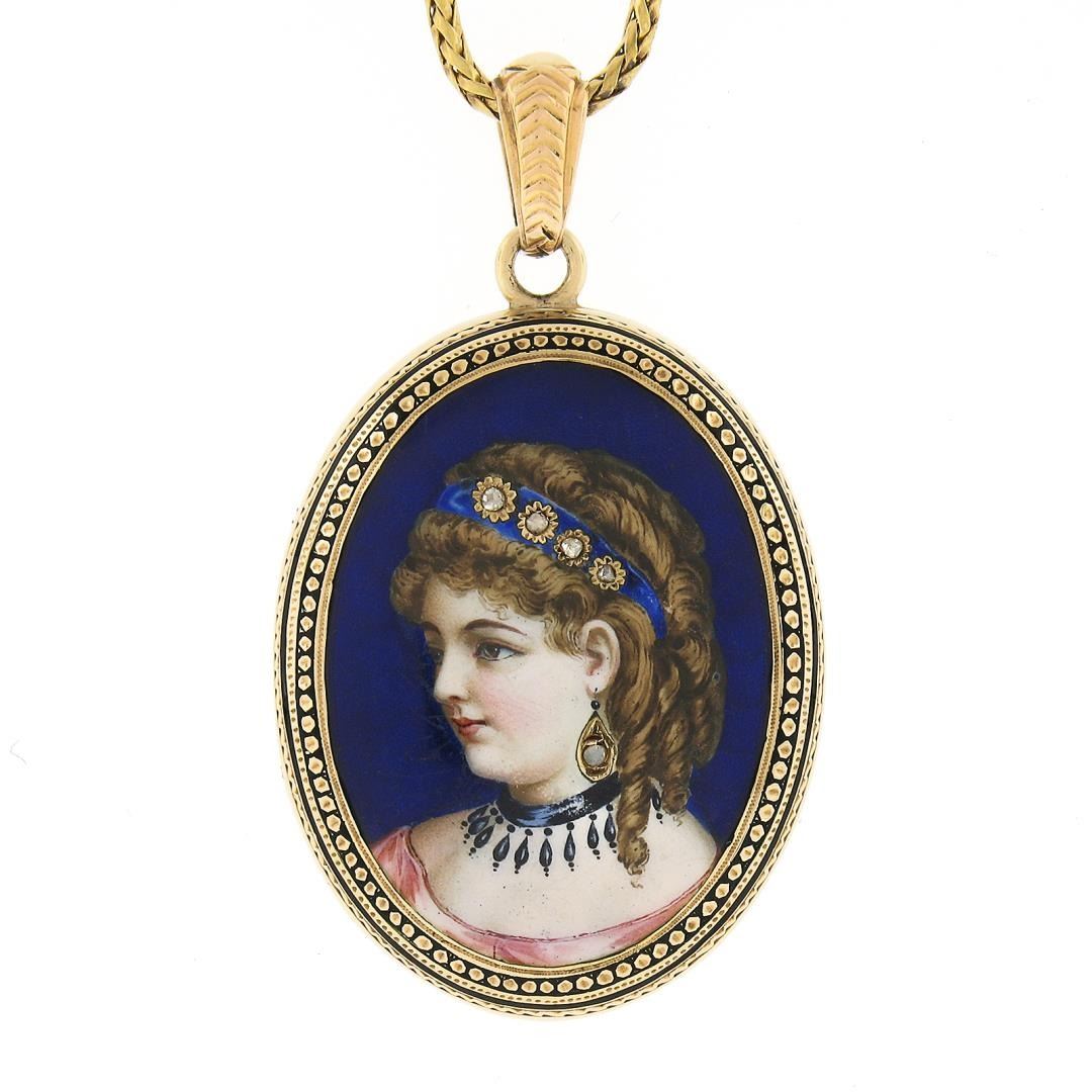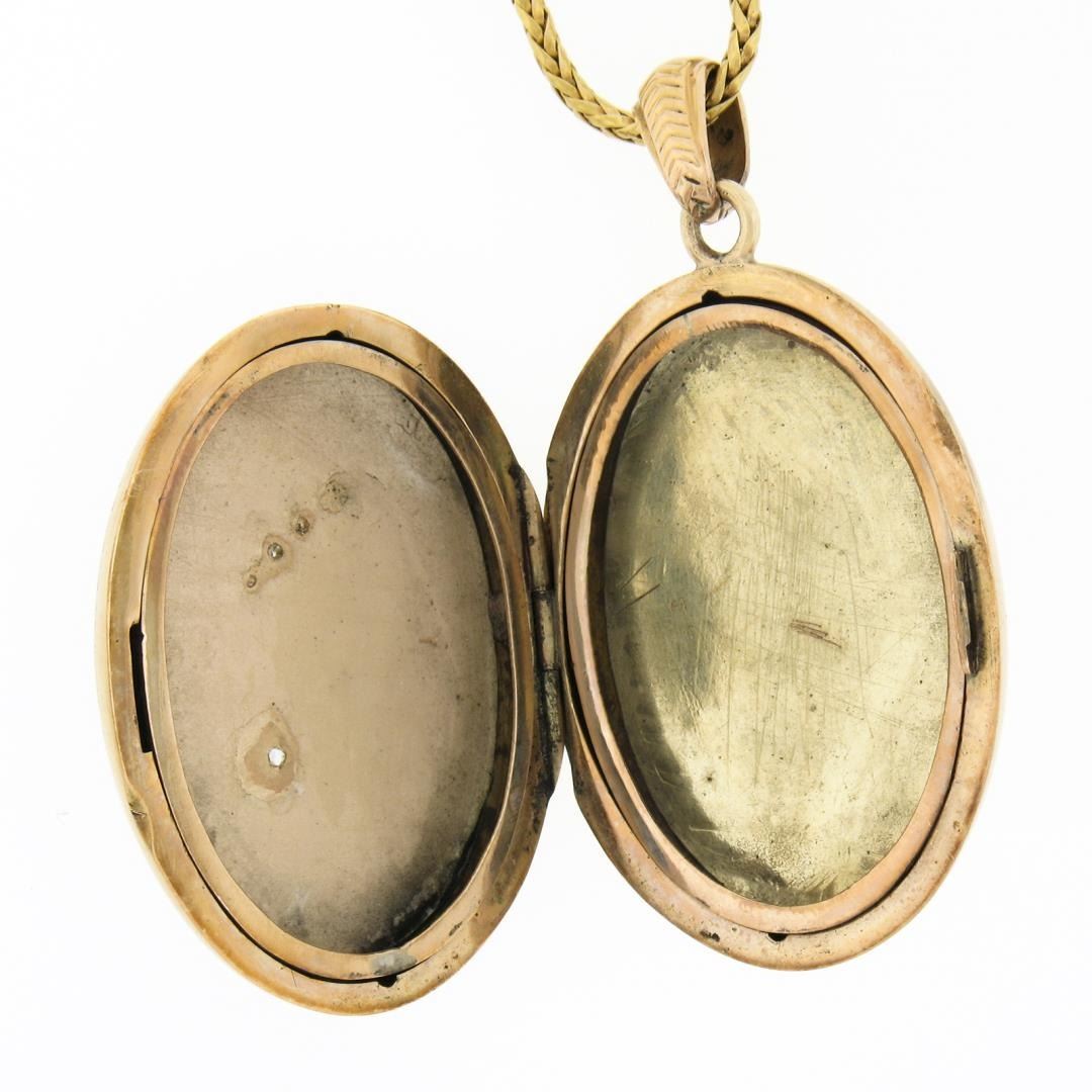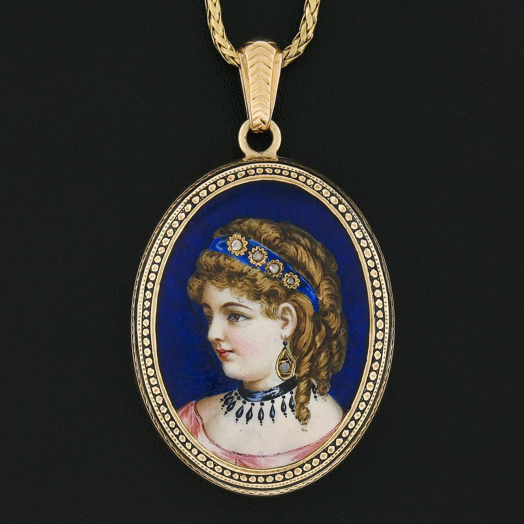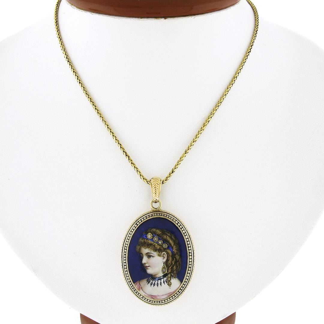 An antique solid 14k yellow gold & enamel world locket pendant necklace, with 5 old rose cut natural diamonds (0.02ctw). 17 inch fancy link chain, 18.83 grams total weight, pendant measures 50.30x28.75mm.
