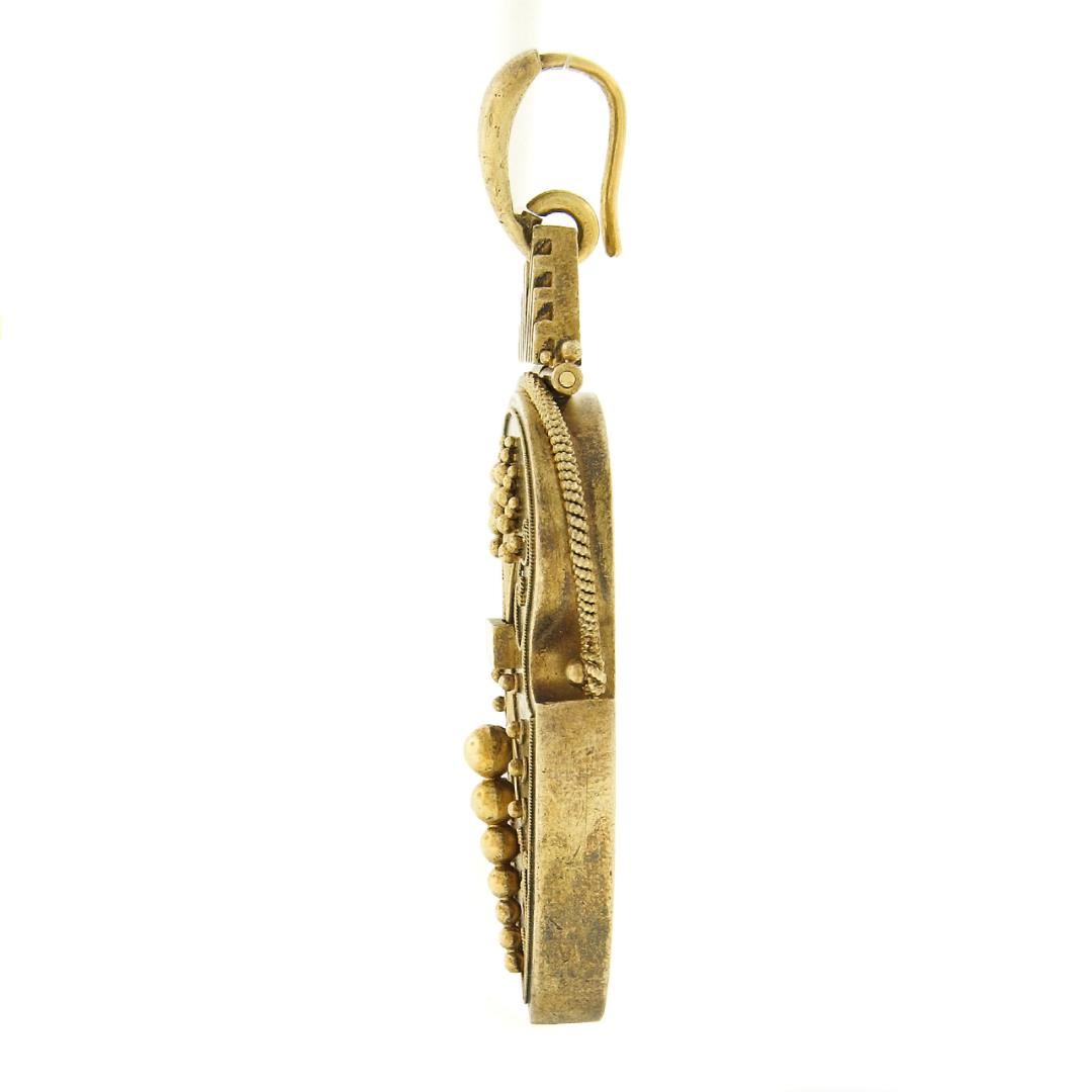 An antique solid 14k yellow gold shield pendant. The pendant weighs a total of 13.43 grams, measures 61.60x31mm including the bail, and the inside of the bail measures ##x##mm.