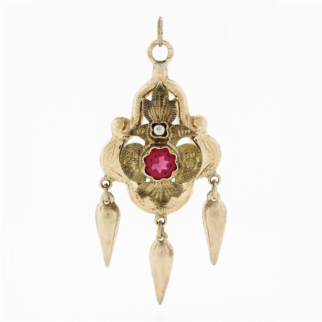 An anrtique victorian solid 14k yellow gold tassel dangle pendant, with 1 round cut red stone (5.7mm), and 1 round shape cultured pearl (2.25mm). The pendant weighs a total of 2.35 grams, measures 54.95x23.5mm including the bail, and the inside of the bail measures 3.85mm.