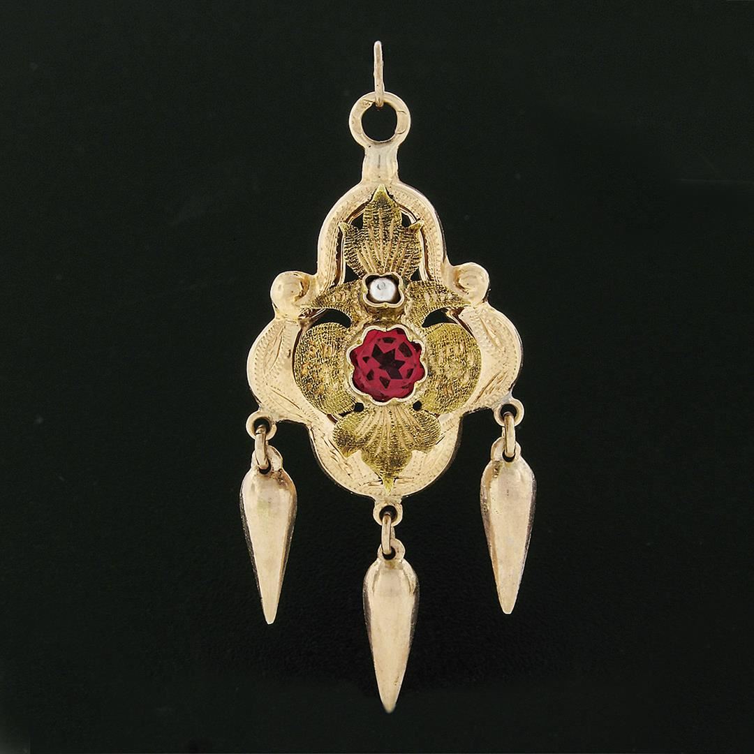 An anrtique victorian solid 14k yellow gold tassel dangle pendant, with 1 round cut red stone (5.7mm), and 1 round shape cultured pearl (2.25mm). The pendant weighs a total of 2.35 grams, measures 54.95x23.5mm including the bail, and the inside of the bail measures 3.85mm.