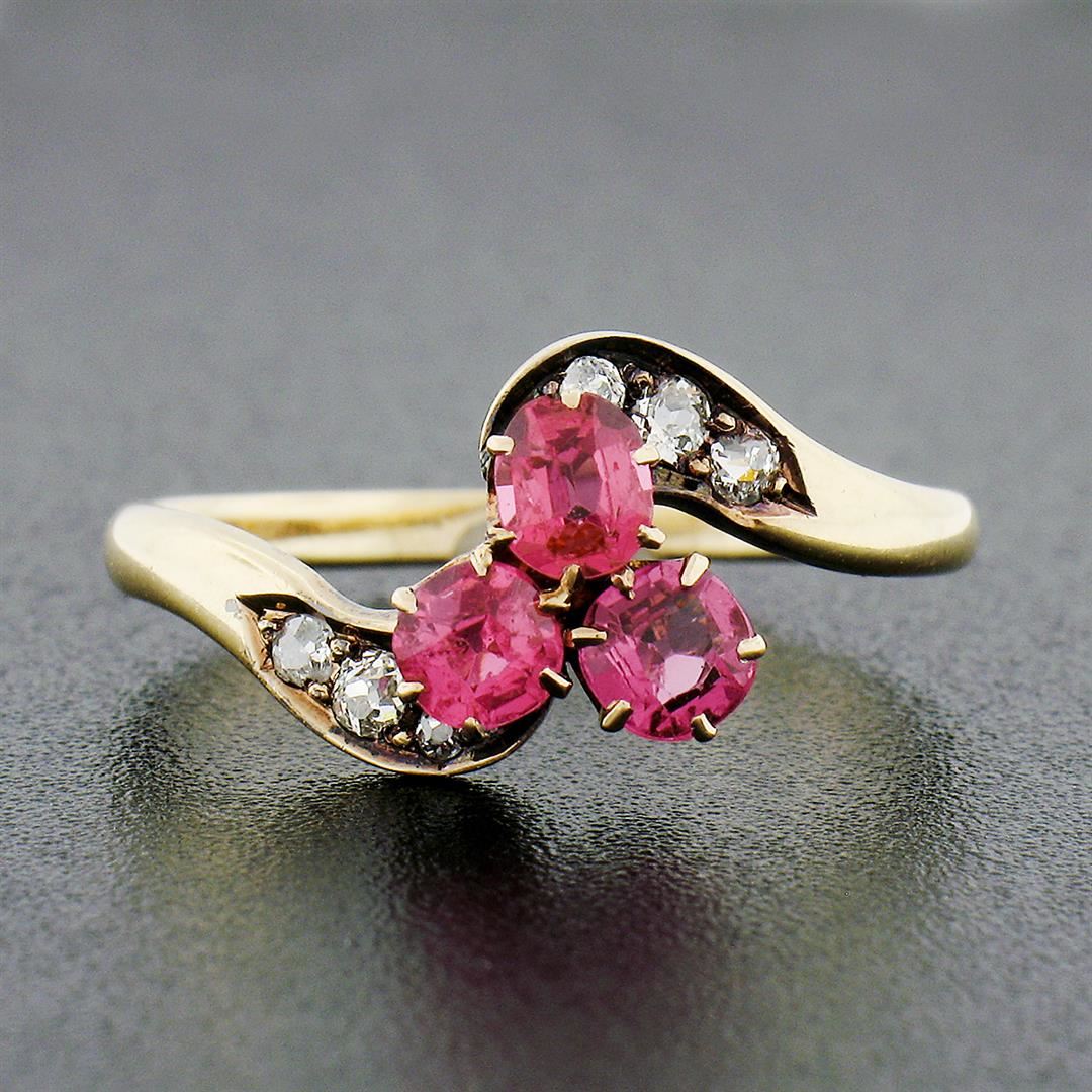 An antique solid 14k yellow gold bypass ring, with Gia certified 3 old mine cut natural spinels (0.90ctw ), and 6 old mine cut natural diamonds (G/H -VS1/VS2 ; 0.14ctw). The ring is size 8.5, weighs a total of 2.54 grams, and measures 11.0mm wide. Comes with all original relevant certifications.