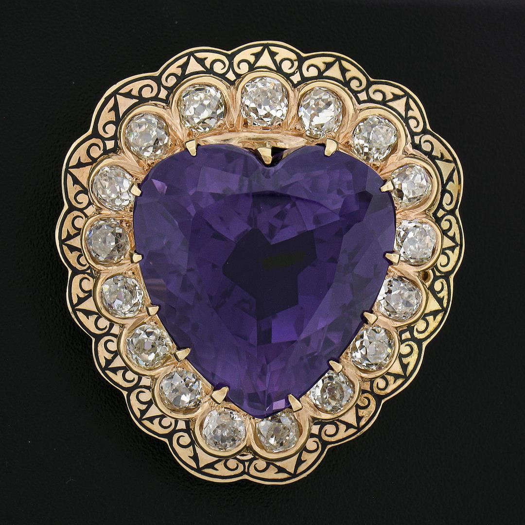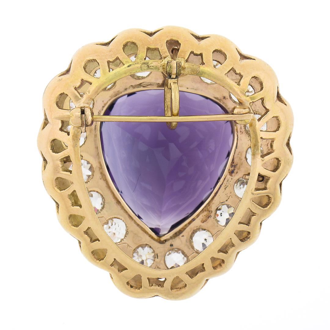 An antique solid 14k yellow gold pendant brooch, with 1 heart cut natural amethyst (30ct ), and 17 old mine cut natural diamonds (J-L - VS2-SI2 w/ a few I1 ; 5.30ctw). Measures 44.3x37mm and weighs a total of 27.31 grams, and the inside bail measurement 5.3x3.6mm.