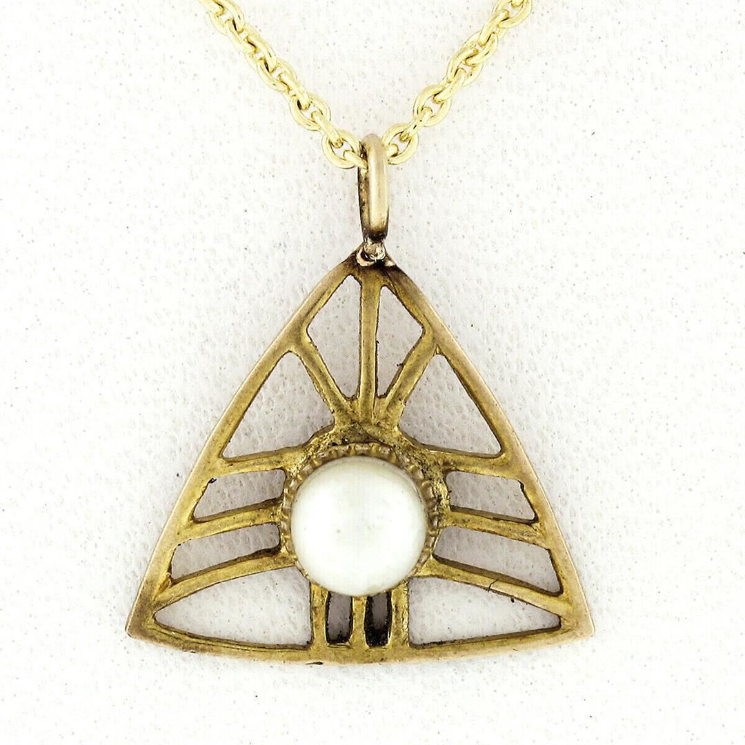 An antique solid 14k rosy yellow gold lavalier pendant & 14k yellow gold chain necklace, with 1 round shape cultured pearl (3.5mm). adjustabel 16 or 18 inch cable link chain, 1.81 grams total weight, pendant height measures 13.75mm.