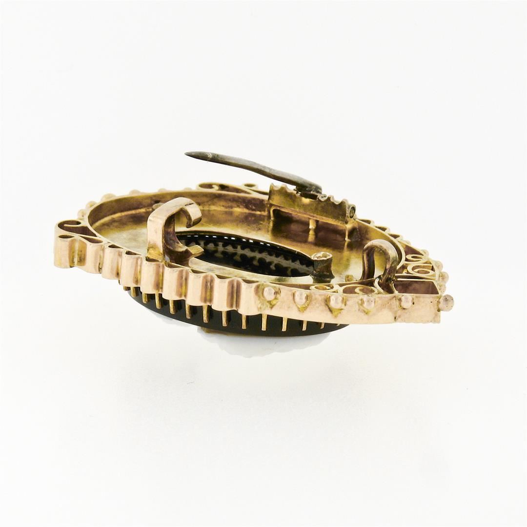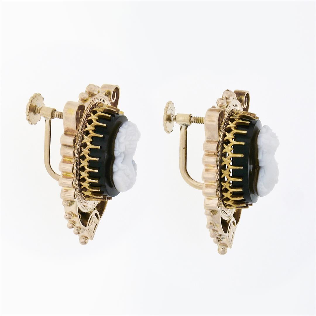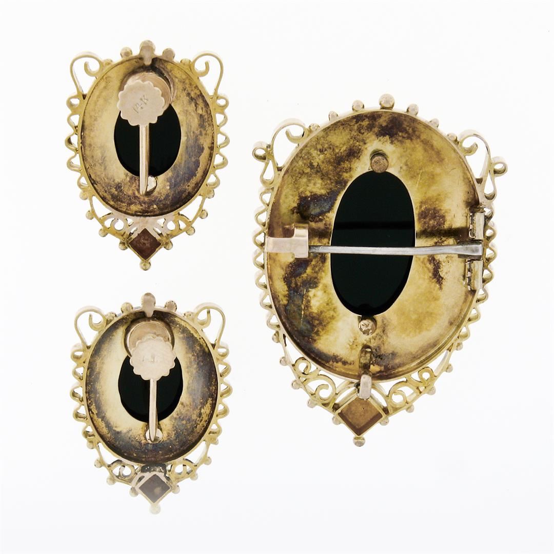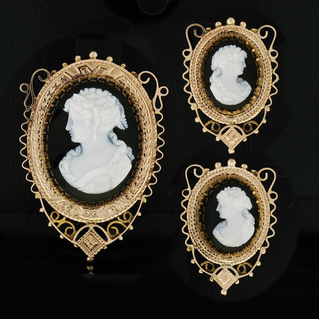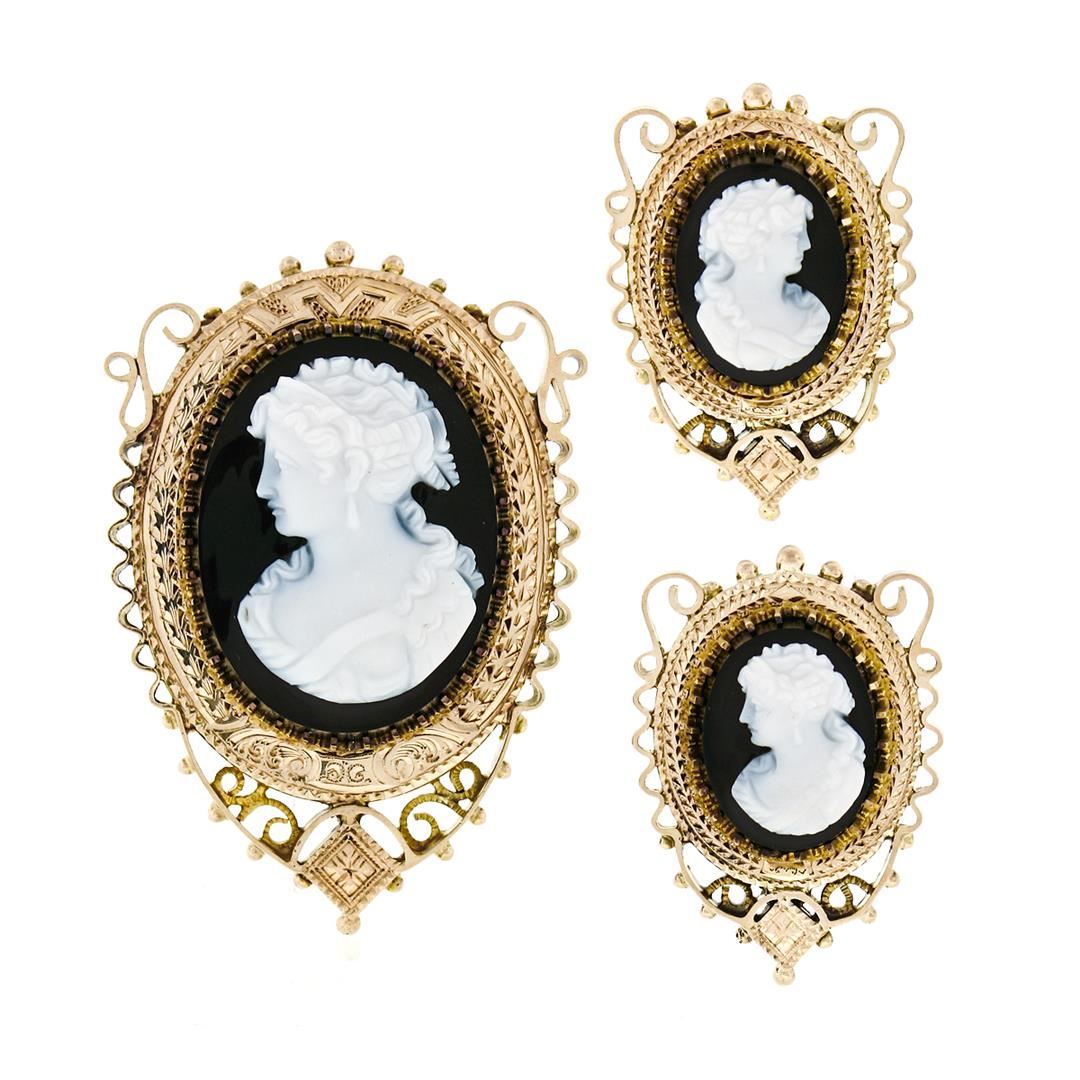 An antique solid 14k yellow gold set of brooch and earrings, with 3 oval cut carved caneo hardstones (13.9x10.8mm (earrings), 24.6x19.2mm (brooch))The brooch measures 42.33x29.31mm. The earrings measure approximately 18.96x27mm, and the set weigh a total of 21.45 Grams grams.