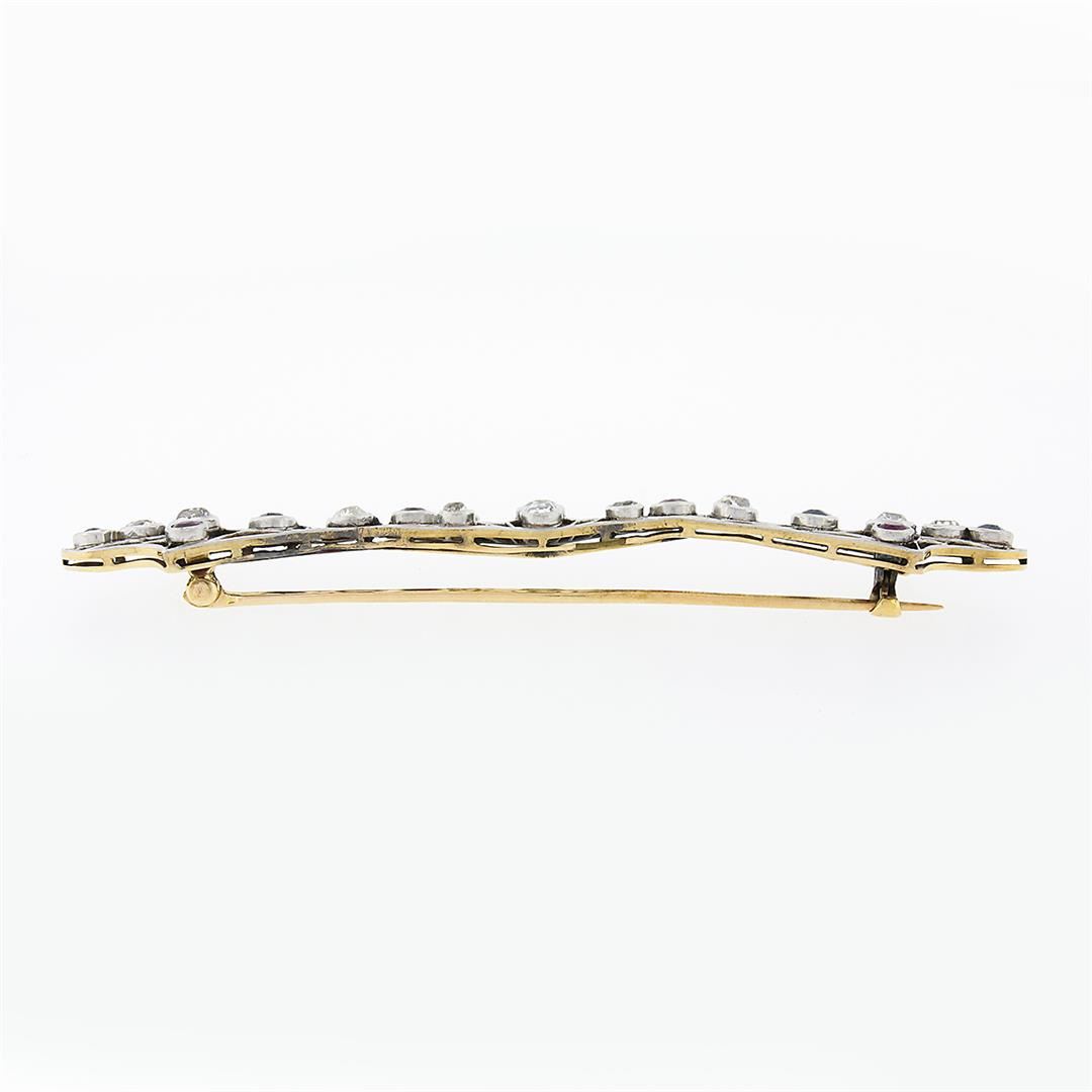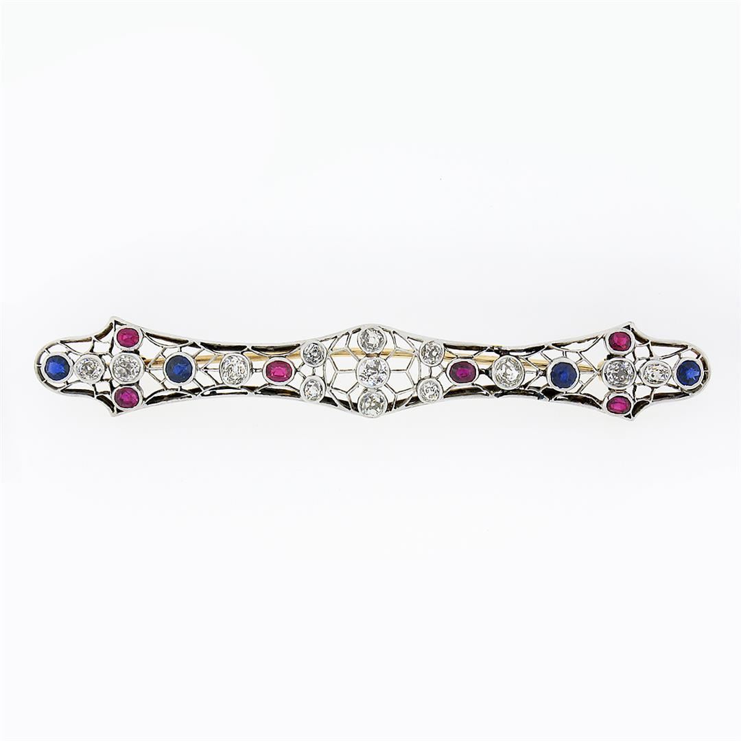An antique solid 14k yellow gold & platinum bar brooch, with 4 Gia certified old round cut natural sapphires (0.80ctw), and 6 Gia certified oval cut natural rubies (1.10ctw ), with 13 old mine cut natural diamonds (H/I - VS1-SI2 ; 1.65ctw). Measures 12.1x87.8mm and weighs a total of 10.23 grams. Comes with all original relevant certifications.