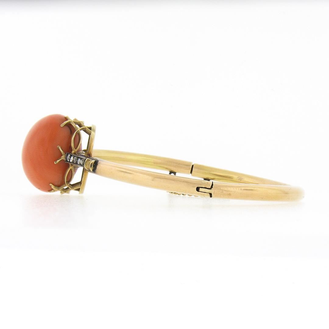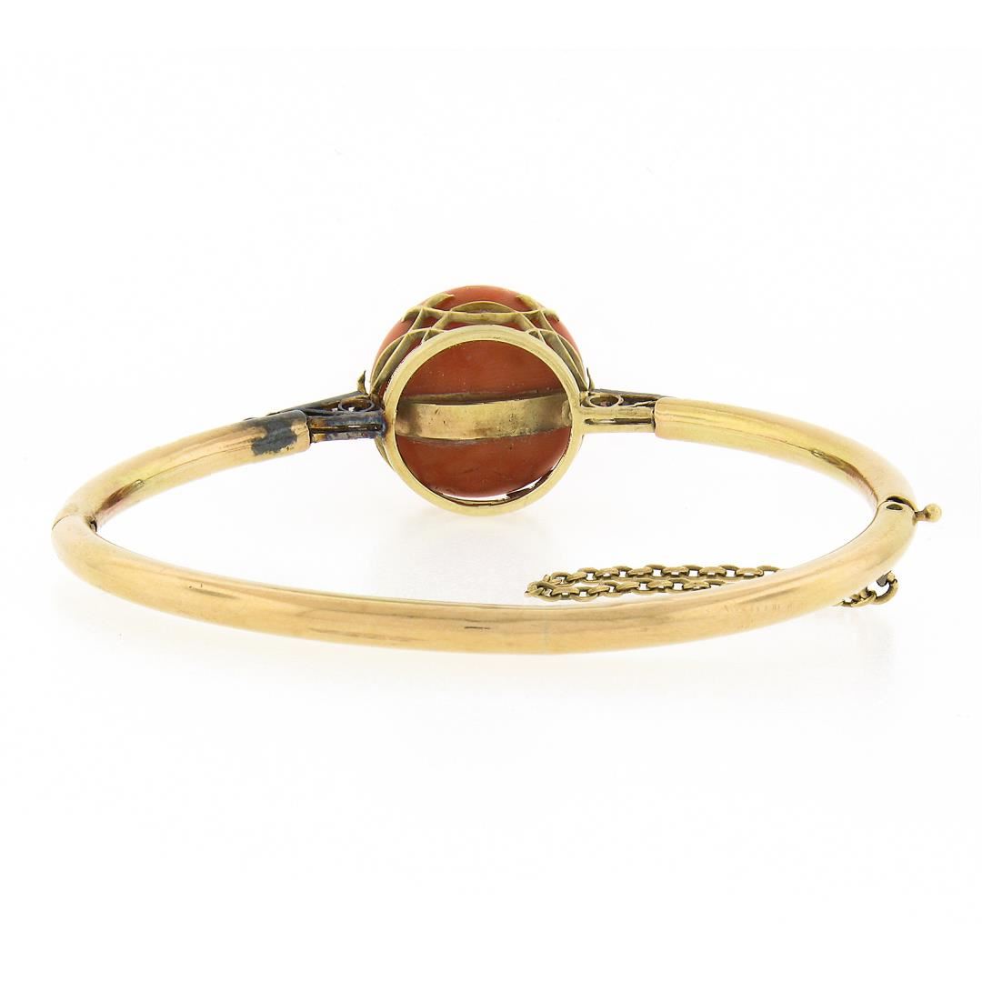 An antique solid 14k yellow gold & silver bangle bracelet, with 1 round shape genuine coral (18.2mm ), and 10 rose cut natural diamonds (G/H - SI1/SI2 ; 0.15ctw). It weighs a total of 19.46 grams, measures 34mm wide, and measures 6.25 inches in length.