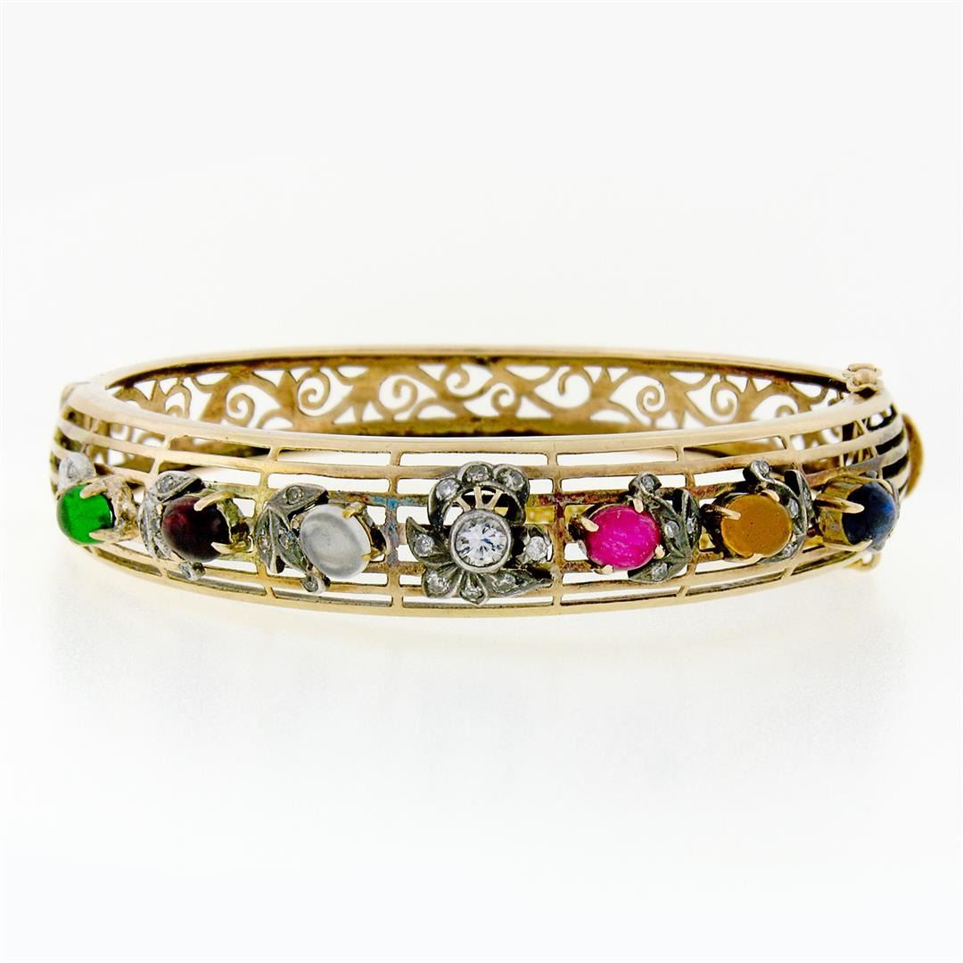An antique solid 14k yellow gold and silver flowers bangle bracelet, featuring 1 old european cut natural diamond (G - VS2 ; 0.18ct), and 30 old single cut natural diamonds (G-I - VS2/SI2 ; 0.42ctw), with oval cabochon cut natural sapphires, citrine, ruby, moonstone, garnet & tsavorite (3.06ctw). It weighs a total of 21.76 grams, measures 12.37mm wide, and measures 6.5 inches in length.