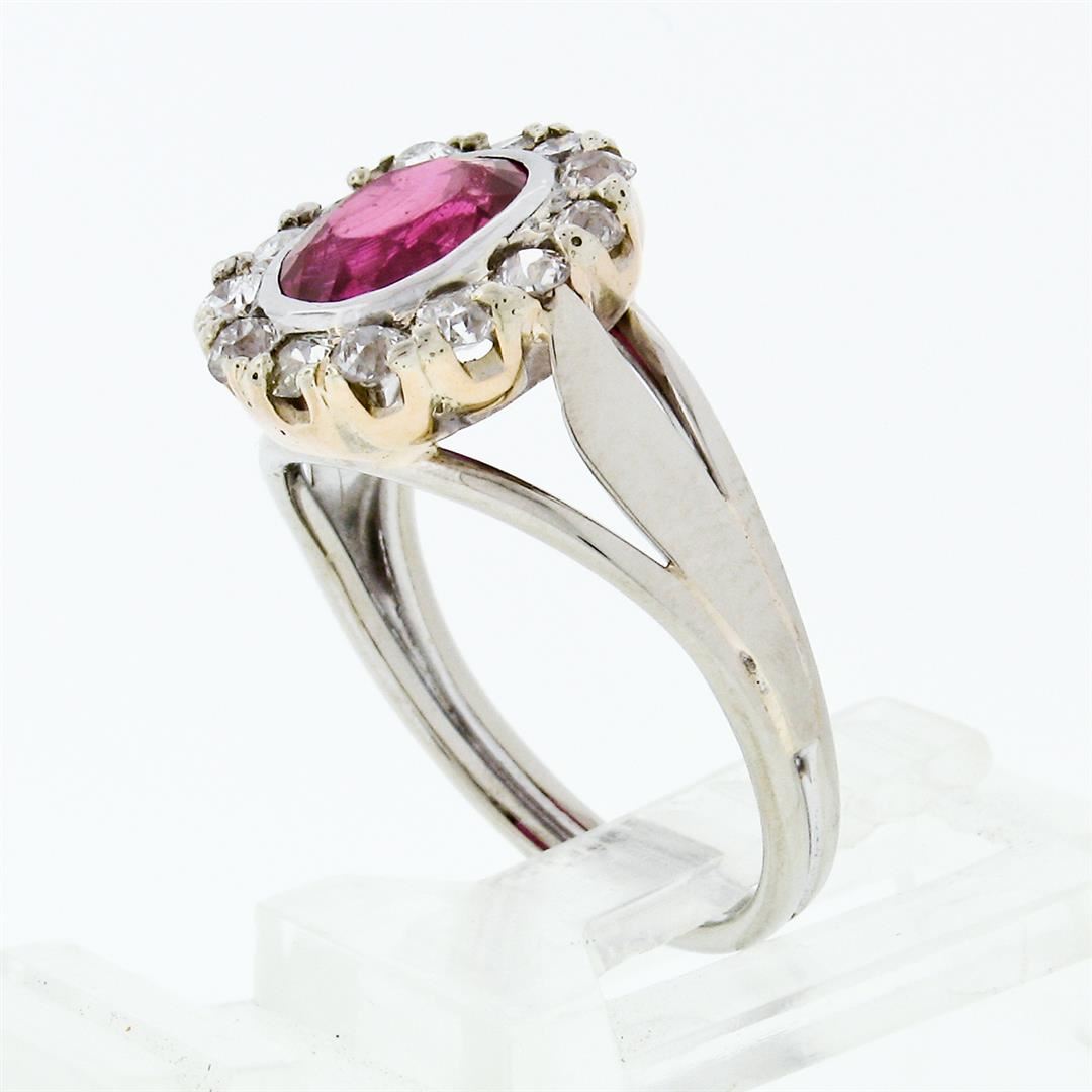 A Victorian era solid two tone 14k gold ring with 1 oval cut red stone (7.30x5.80mm) and halo of 18 round cut natural diamonds (H/I - VS1 to SI1; 0.50ctw). The ring is size 6.0, weighs a total of 3.55 grams, and measures 12.19mm wide.