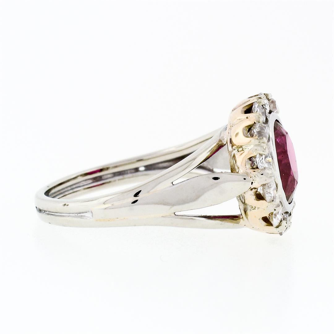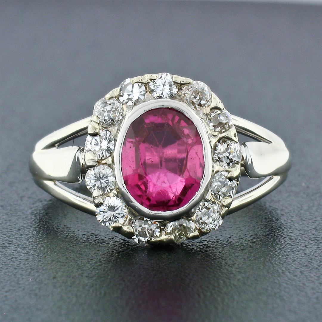 A Victorian era solid two tone 14k gold ring with 1 oval cut red stone (7.30x5.80mm) and halo of 18 round cut natural diamonds (H/I - VS1 to SI1; 0.50ctw). The ring is size 6.0, weighs a total of 3.55 grams, and measures 12.19mm wide.