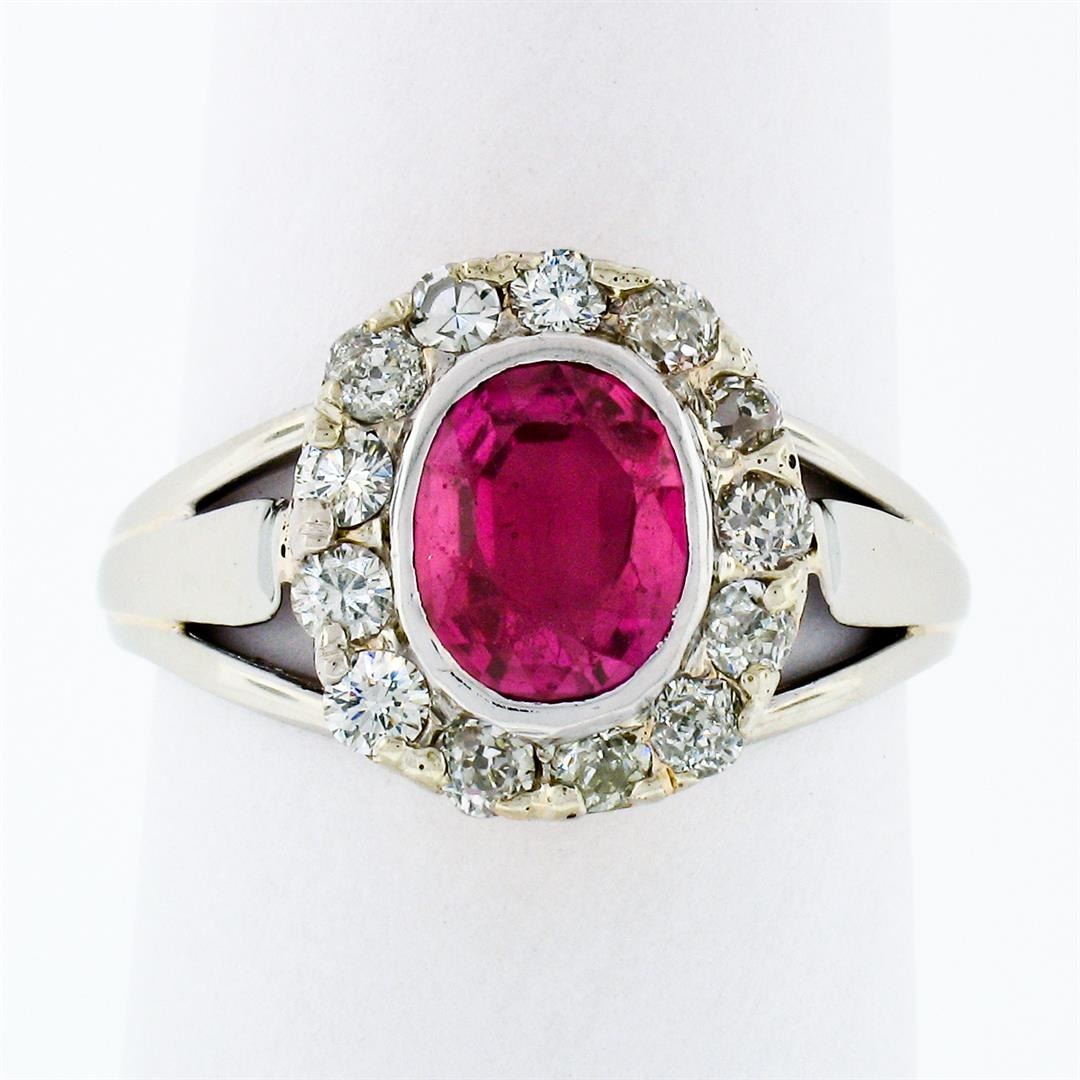 A Victorian era solid two tone 14k gold ring with 1 oval cut red stone (7.30x5.80mm) and halo of 18 round cut natural diamonds (H/I - VS1 to SI1; 0.50ctw). The ring is size 6.0, weighs a total of 3.55 grams, and measures 12.19mm wide.
