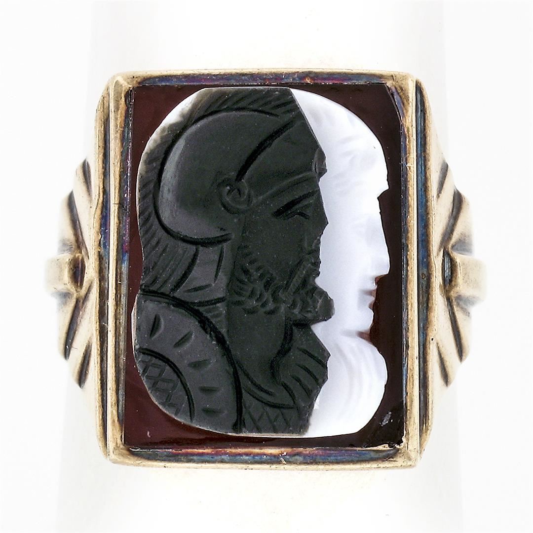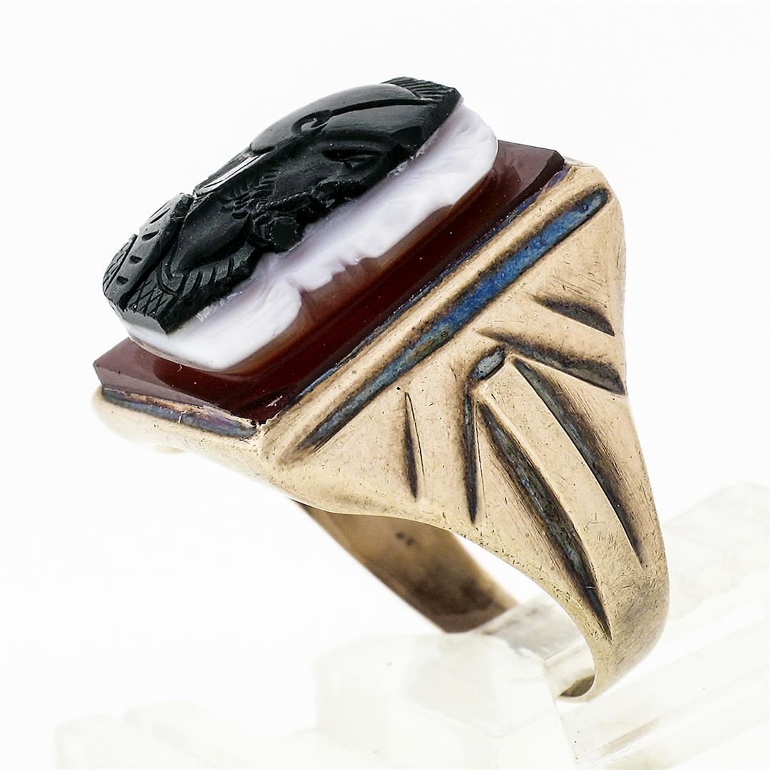 A Victorian solid 14k yellow gold cameo ring, with 1 carved dual cameo natural agate (15.05x10.89mm), and flat rectangular cut natural carnelian (16.65x12.40mm). The ring is size 7.0, weighs a total of 5.44 grams, and measures 17.38mm wide.