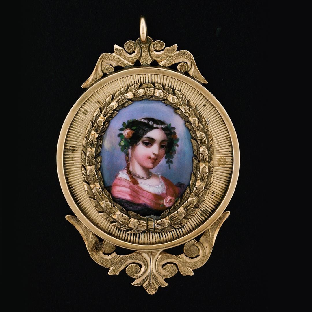 An antique solid 14k yellow gold hand painted portrait pendant. The pendant weighs a total of 9.39 grams, measures 49.15x31.75mm including the bail, and the inside of the bail measures 2.50mm in diameter.
