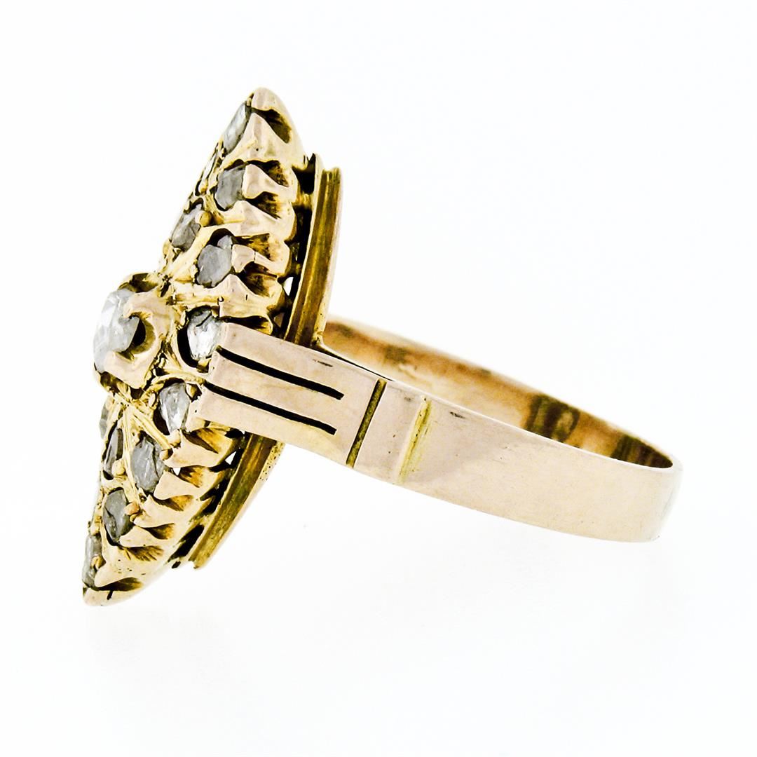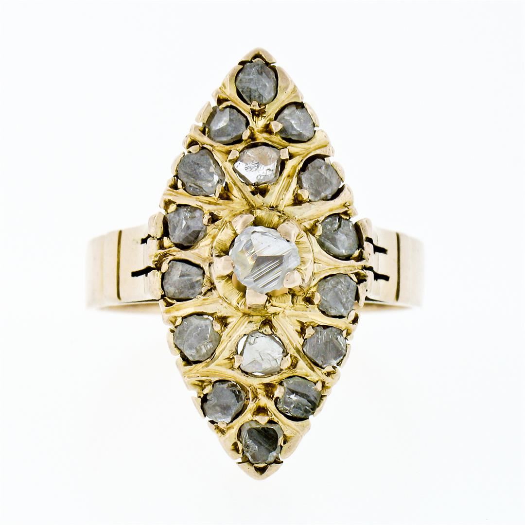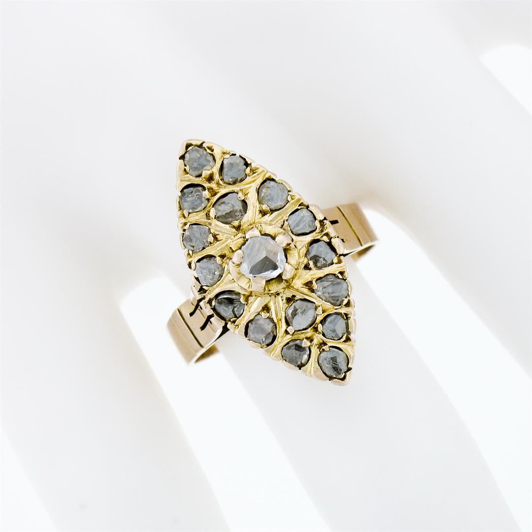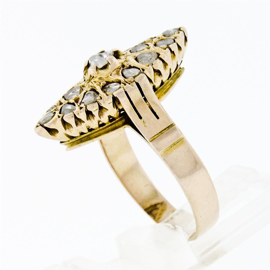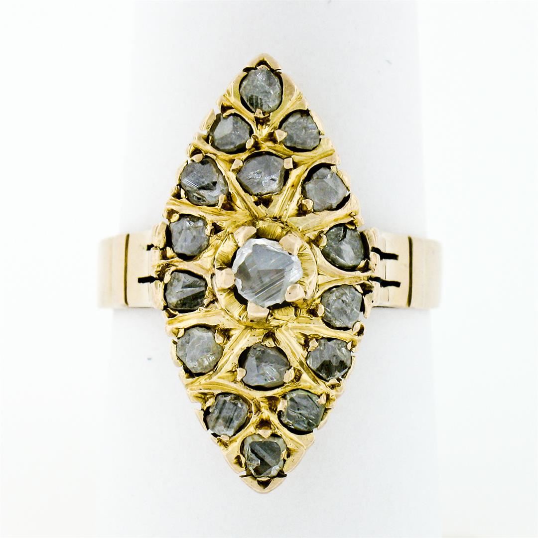 An antique solid 14k yellow gold navette ring, with 17 rose cut natural diamonds (1.40ctw). The ring is size 8.0, weighs a total of 4.78 grams, and measures 23.75mm wide.